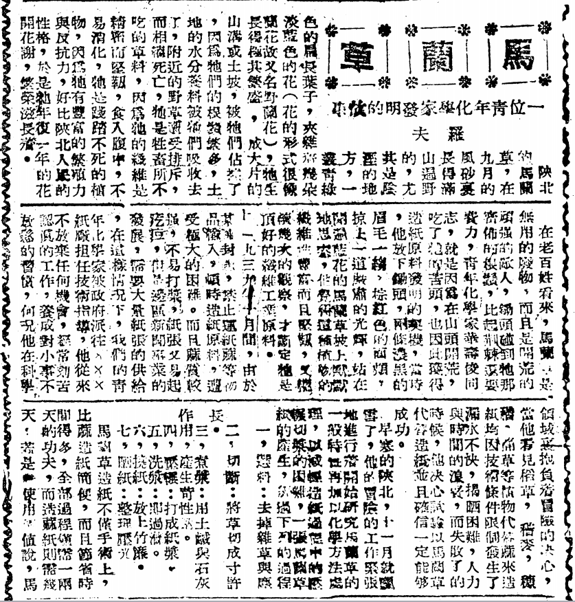一项重大的发明创造就这样诞生了,马兰草造纸,不仅缩短了生产流程,降低了生产成本,还提高了纸张产量和质量。一向被百姓视为废物的草,竟然变废为宝。到1942年,边区共建成造纸厂12个,基本上满足了边区出版书报和办公、学习用纸。