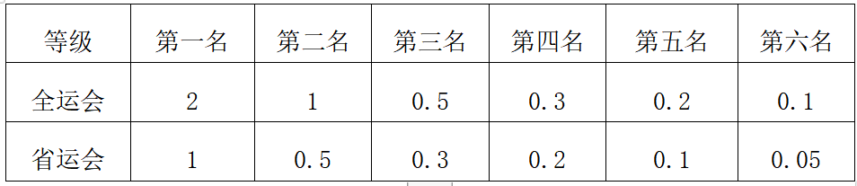 (4)学生获全国大学生运动会、省级大学生运动会前6名等,加分标准如下: