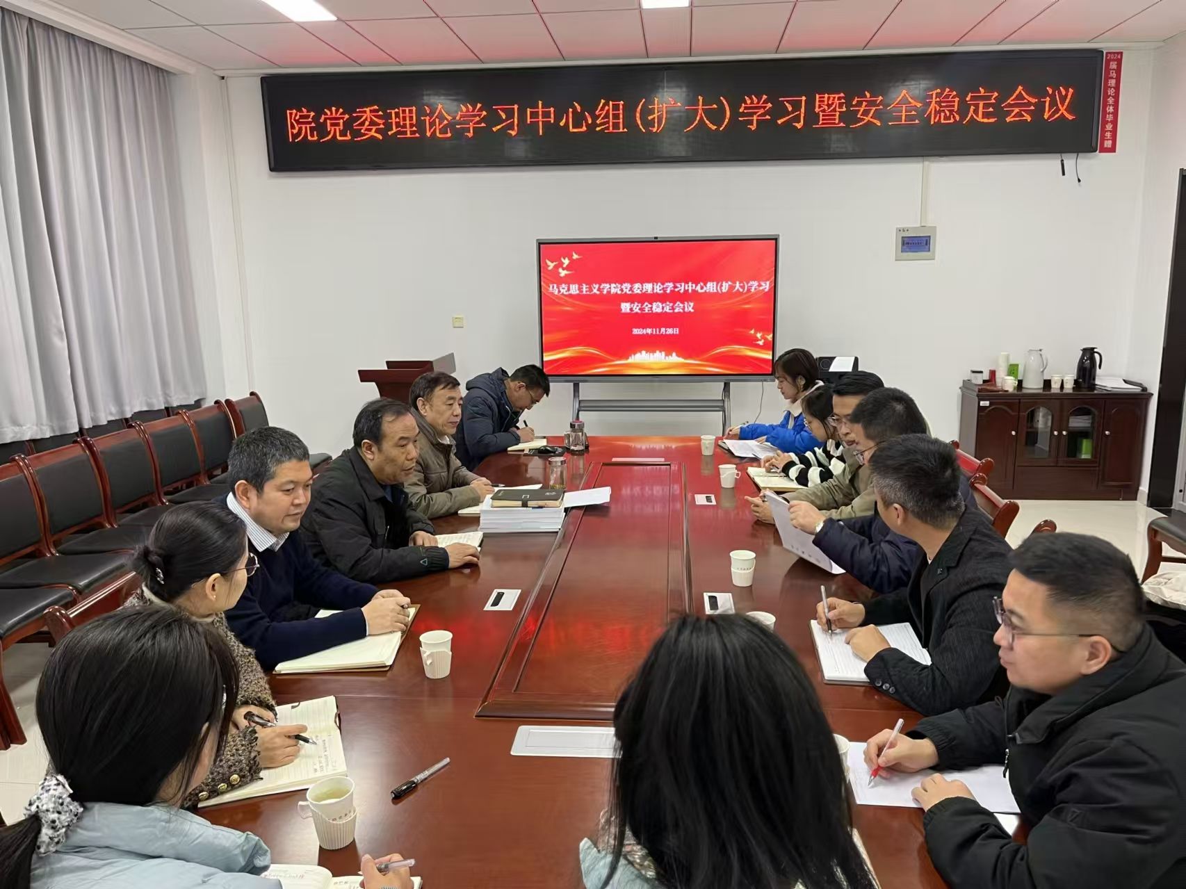 在三楼会议室召开了院党委理论学习中心组(扩大)学习暨安全稳定会议,学院全体领导班子成员、各党支部书记,教师、学生党员代表及全体行政人员参加了本次学习会,会议分两个阶段进行,由党委书记张彬主持。