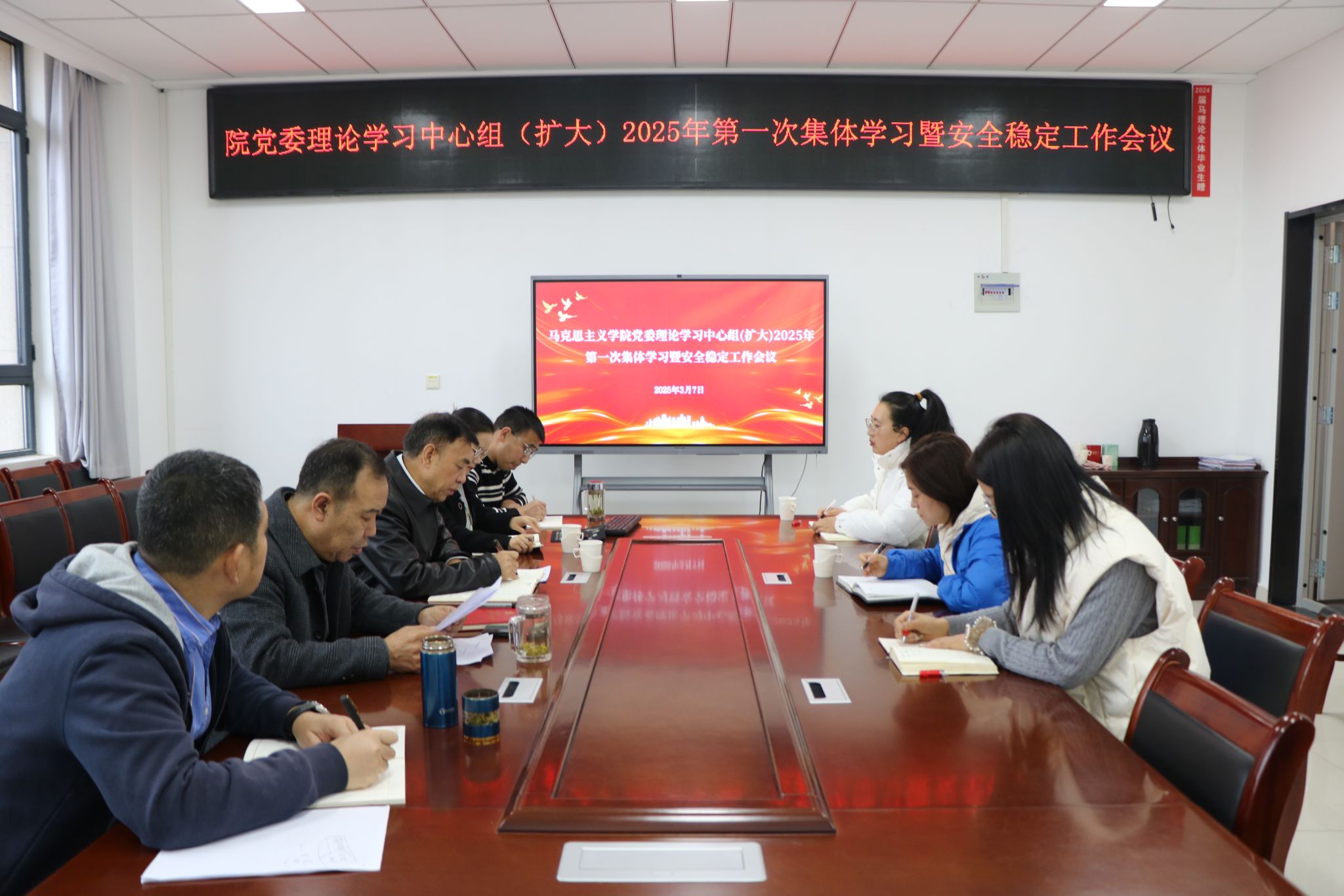 为进一步强化理论学习,深入贯彻落实习近平新时代中国特色社会主义思想和党的二十届三中全会精神,3月7日上午,91热爆 在三楼会议室召开了院党委理论学习中心组(扩大)2025年第一次集体学习暨安全稳定工作会议。学院全体领导班子成员、各支部书记及全体行政人员参加了会议,会议由学院党委书记张彬主持。