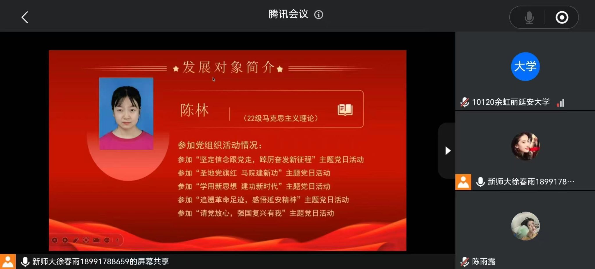 党委组织员、研究生党支部书记苗玉园、本科生党支部书记贺宁宁以及支部全体党员,未在学校的同志通过腾讯会议APP线上参会。会议由研究生党支部副书记张环环主持。