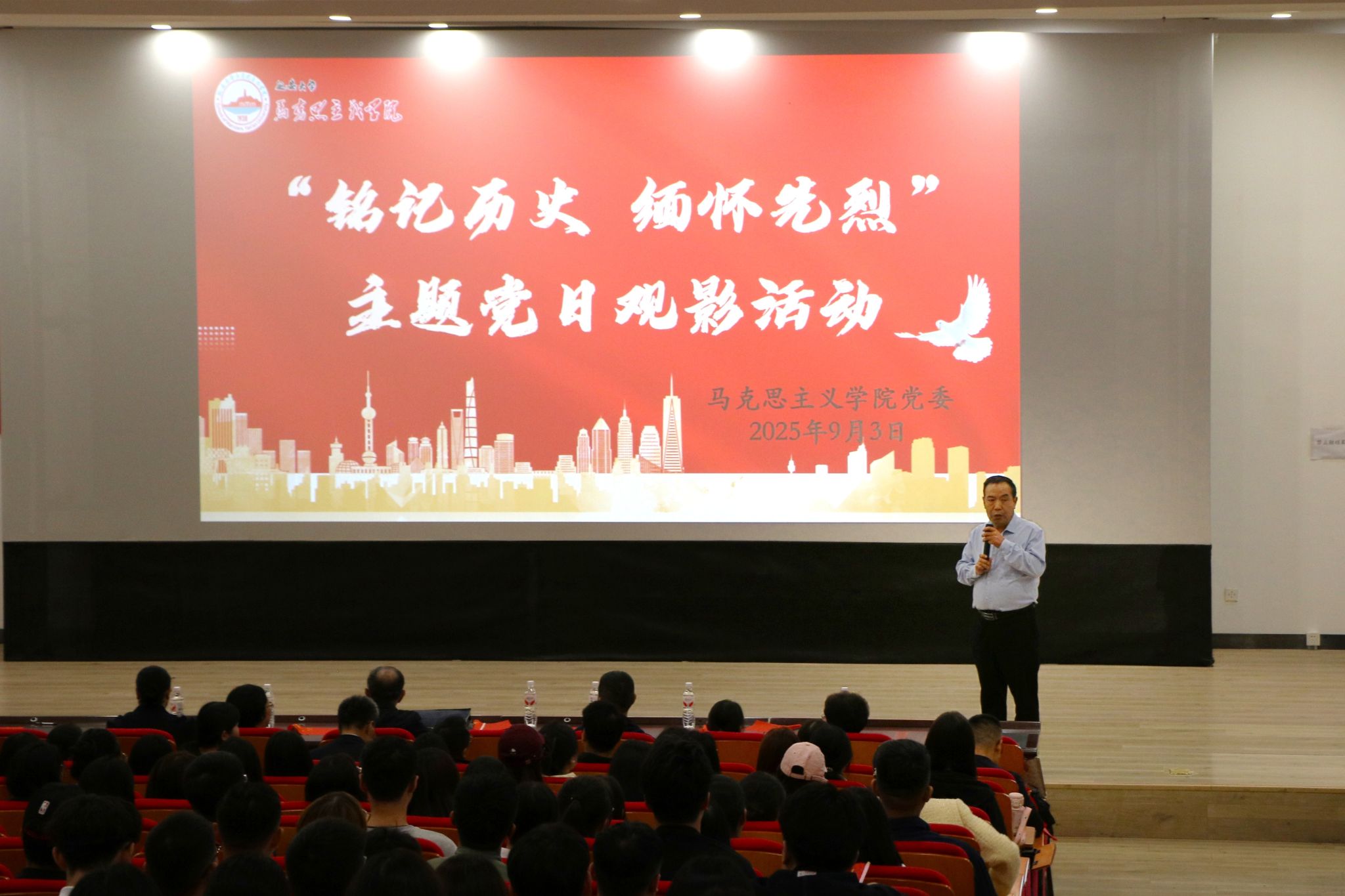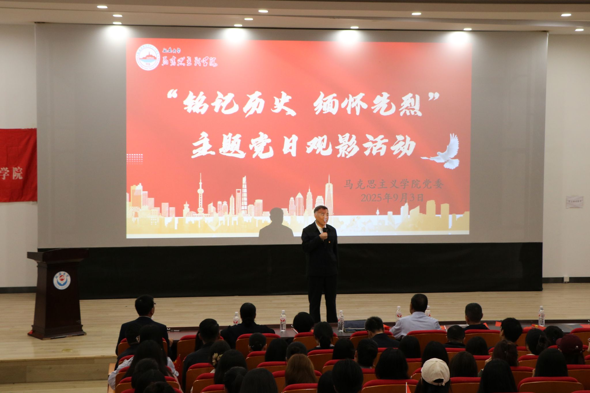 党委组织全体师生在大学生活动中心红色影院开展了“铭记历史 缅怀先烈 珍爱和平 开创未来”主题党日观影活动。活动由党委书记张彬主持。
