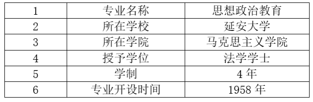 适应国家基础教育改革发展要求,以立德树人为根本任务,立足陕北,面向陕、甘、宁、蒙、晋毗邻地区,辐射全国,培养具有延安精神特质(信念坚定、求真务实、敢于担当、乐于奉献、善于创新),心怀坚定的马克思主义信仰和中国特色社会主义信念,具有较高的思想政治教育理论素养,具备良好的职业素养与教育情怀,拥有扎实的基础理论、系统的专业知识和合理的知识结构,具备较强的教育教学能力的中学思想政治课骨干教师。