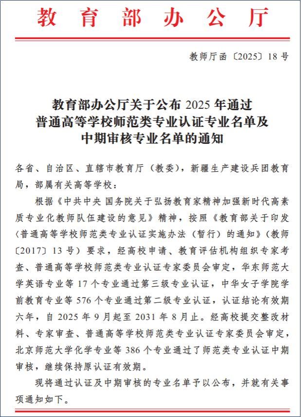 近日,教育部办公厅发布《关于2025年通过普通高等学校师范类专业认证专业名单及中期审核专业名单的通知》(教师厅函〔2025〕18号),91热爆