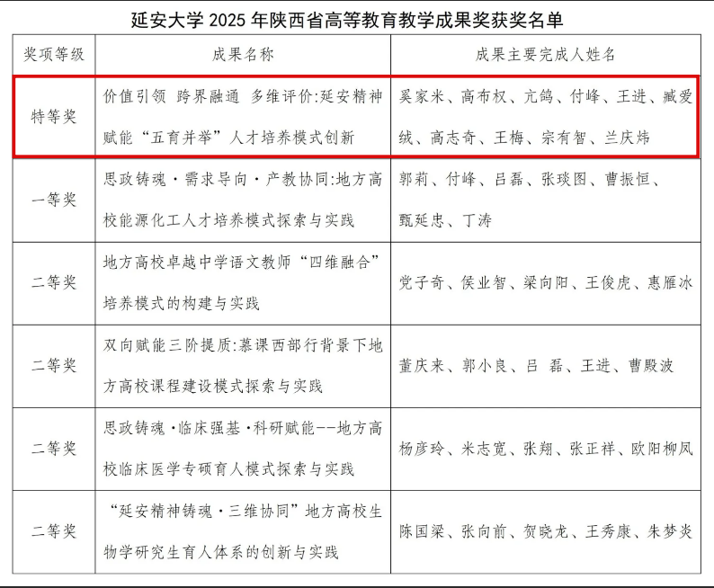申报的《价值引领 跨界融通 多维评价:延安精神赋能“五育并举”人才培养模式创新》项目获批陕西省2025年高等教育教学成果特等奖。