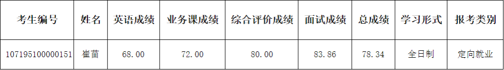 研究生招生考试工作领导小组研究决定,现将1个非定向招生计划转录为定向招生计划,按成绩进行递补录取,递补人员为崔苗。