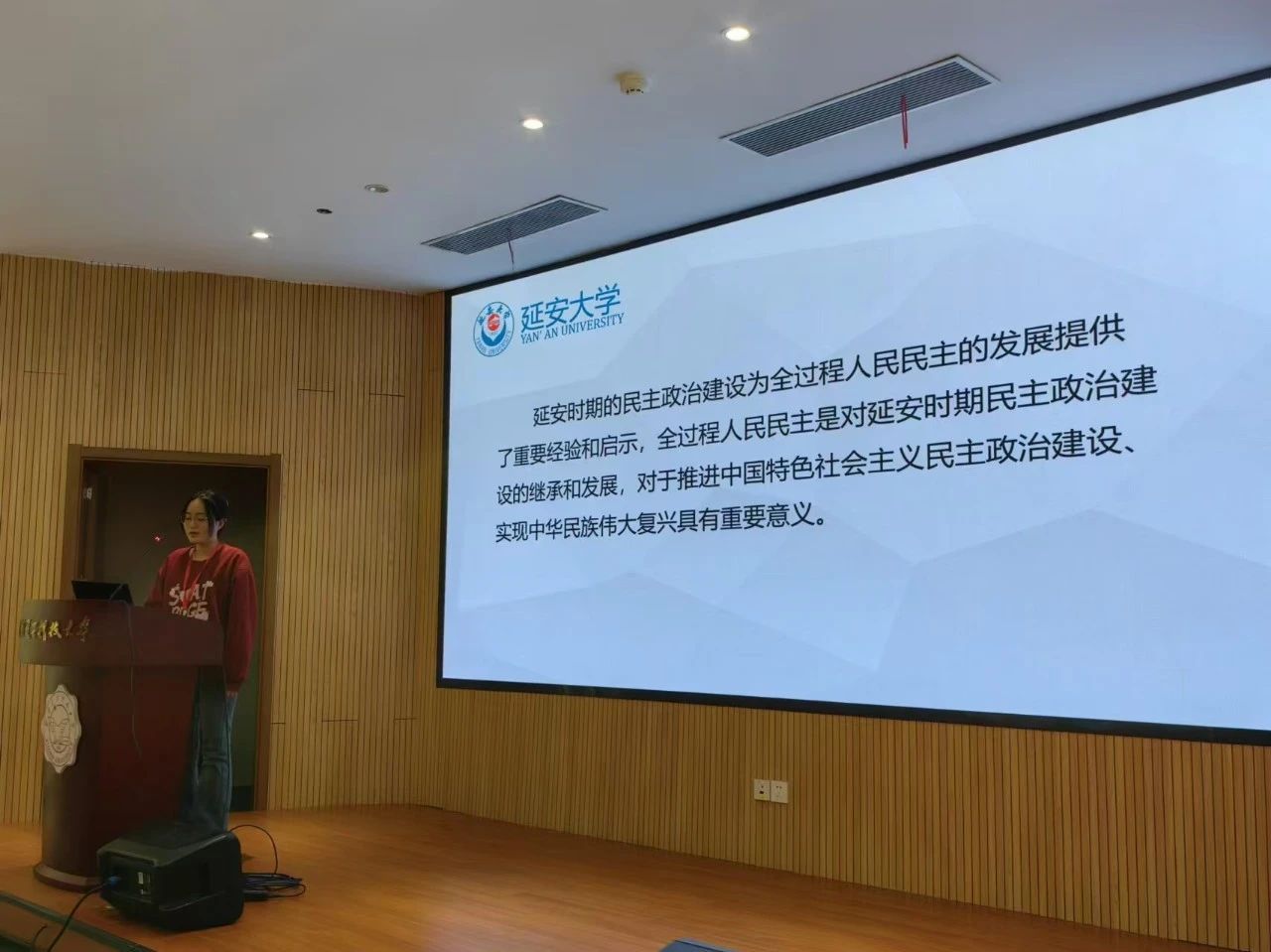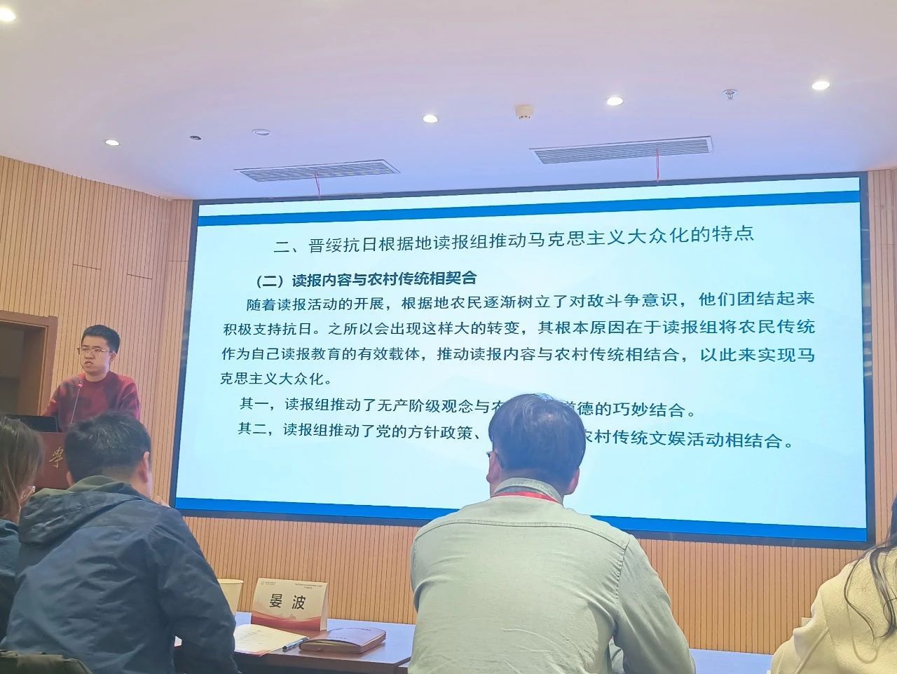 五位硕士研究生以文参会,分别有李银阁的《全过程人民民主对延安时期〈为人民服务〉核心要义的继承与发展》、庞珂庆的《延安时期新秧歌运动的文化育人功能探析》、刘洋的《延安时期晋绥抗日根据地马克思主义大众化研究——以读报组为中心考察》、水浩田的《中华优秀传统文化与中国式现代化五大特征之关联探究》、刘原伶的《陕北公学是中国式高等教育现代化的重要源流:经验、特征与启示》,其中李银阁、庞珂庆、刘洋三位同学作了现场汇报。