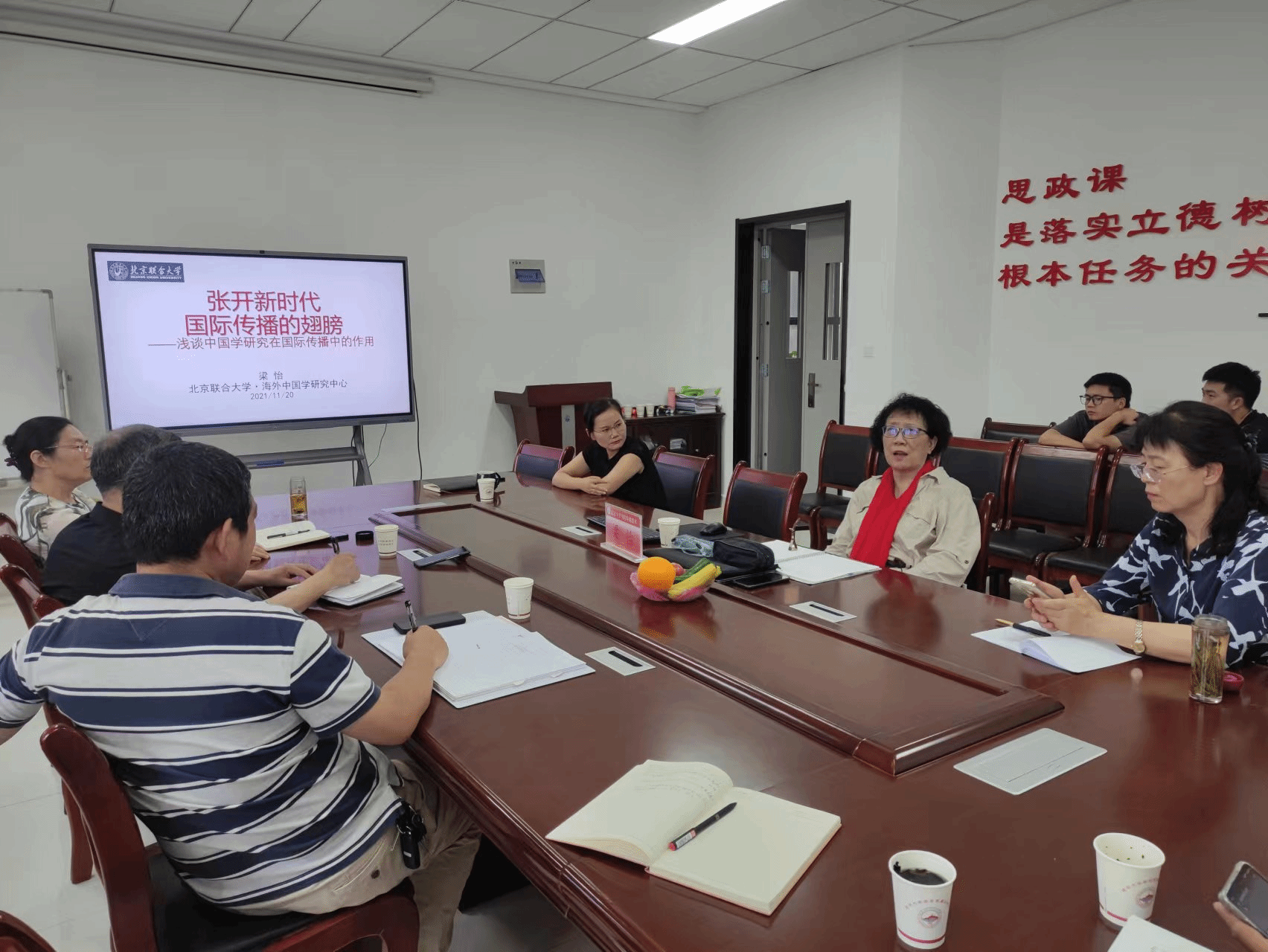 的学科建设和学科特色,然后对思政课教师的成长谈了几点想法,她认为思政课教师使命崇高、责任重大,要有政治素养、国际视野、能够从事跨学科研究、成为复合型人才,方能在思想上引领互联网时代的高校大学生,做好立德树人的本职工作。随后,梁怡教授以《张开新时代国际传播的翅膀——浅谈中国学研究在国际传播中的作用》为题作报告,结合自己的亲身经历给大家传授马院教师如何讲好中国故事的经验。参与座谈的各位老师与梁怡教授充分交流,表示受益匪浅。