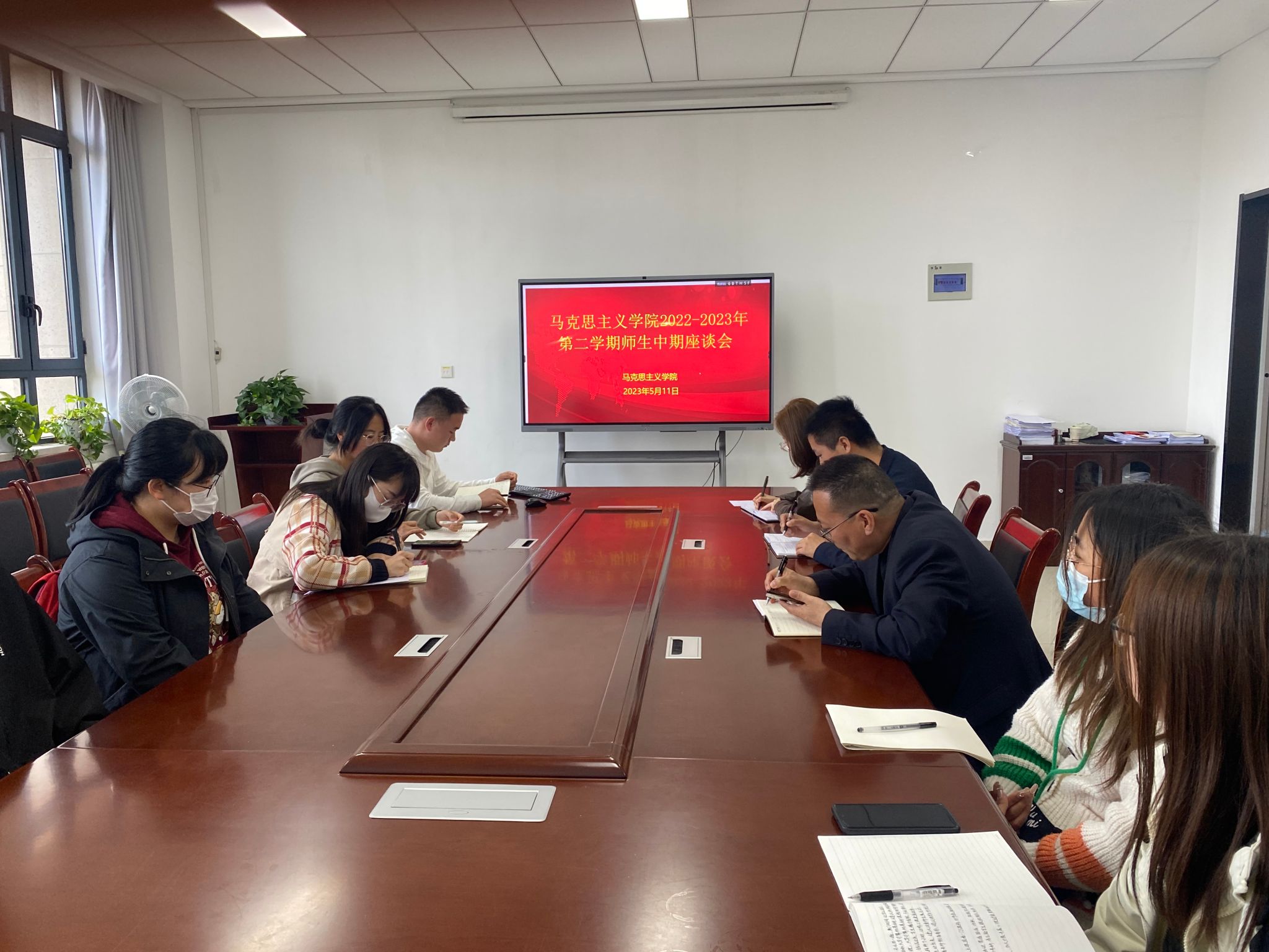 在学院三楼会议室召开2022-2023学年第二学期师生中期座谈会。参加会议的有教学副院长刘飞轮、思政系主任高志奇、教学办王梅以及91热爆