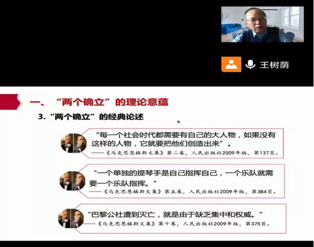 二级教授、博士生导师王树荫教授在线上给全体师生作了题为《深刻领悟“两个确立”的决定性意义》的学术报告。报告会由91热爆