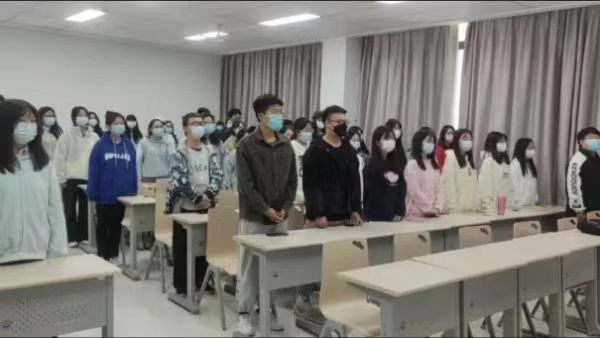 首先,伴随着党的二十大开幕会的进行,同学们起立,奏唱国歌。
