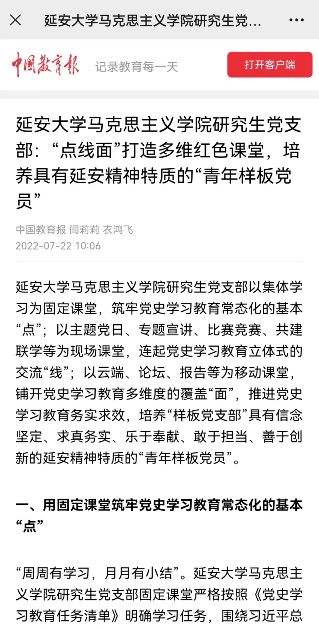 党委推荐的党史学习教育工作案例——《“点线面”打造多维红色课堂,培养具有延安精神特质的“青年样板党员”》在《中国教育报》客户端发表。