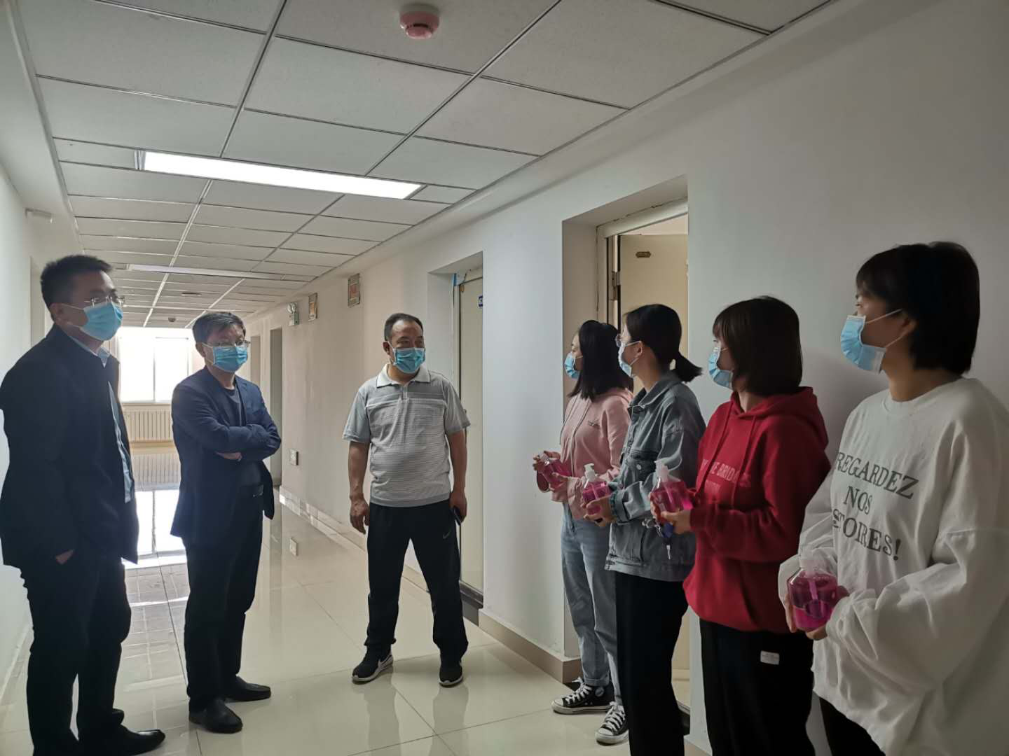 来到学生宿舍,三位院领导与同学们进行了亲切的交流,询问了同学们的身体状况、防疫物资准备情况、饮食居住生活情况等,并亲自将学院准备的洗手液发放到每个宿舍,同时叮嘱同学们继续注意个人防护,严格落实一日三次体温测量和体温异常及时报备制度,在学校封闭管理期间未经批准切勿私自外出,有任何需要帮助、解决的问题及时与学院沟通、联系。另外,院领导还对返校同学的论文撰写情况、就业进展情况等进行了详细的了解,并引导同学们在完成毕业论文设计的同时树立正确的择业观、就业观,以积极的心态面对学习和工作。