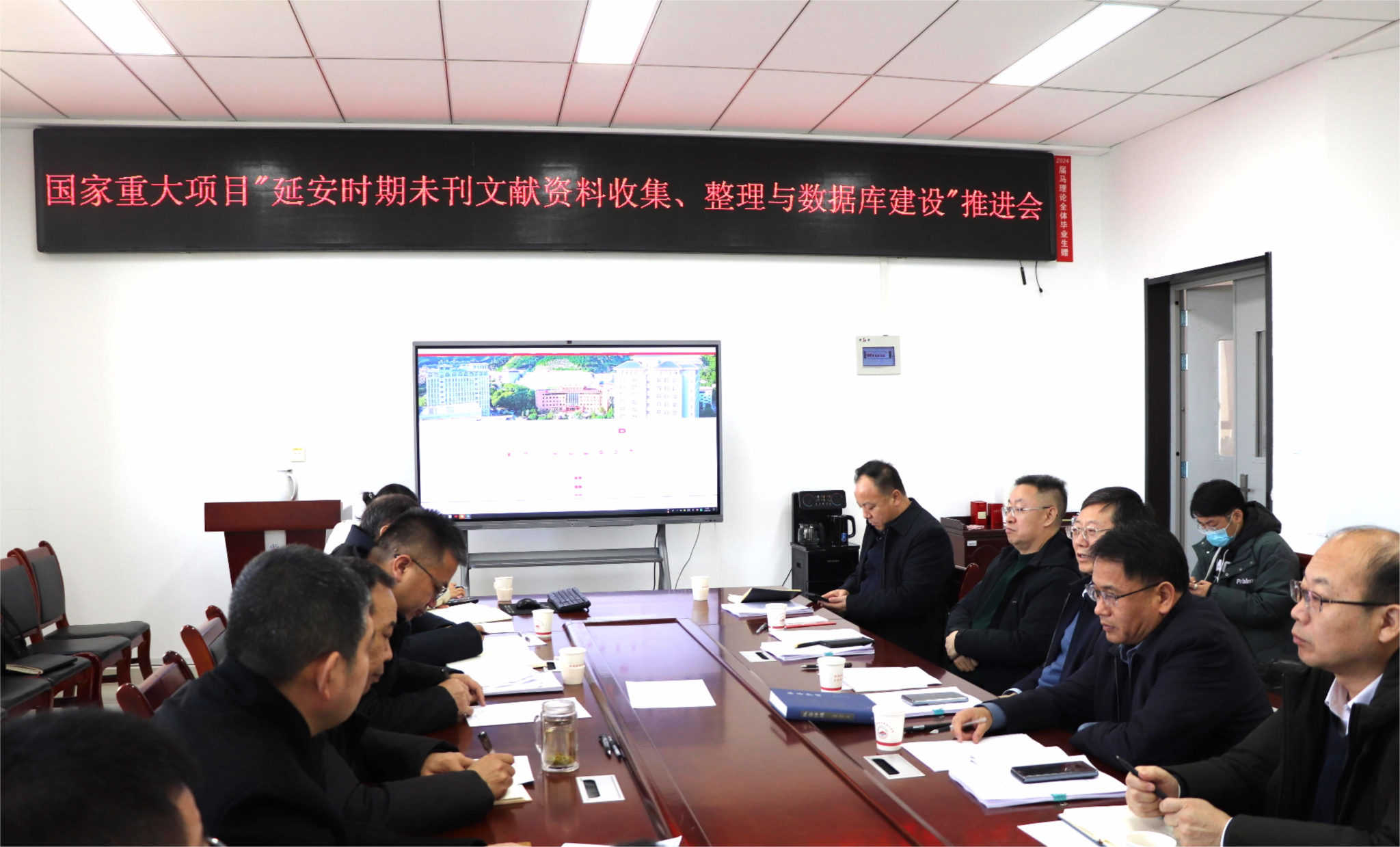 会上,张金锁教授首先对举行此次推进会的重要性和必要性进行了说明;谭虎娃副校长向与会成员介绍了国家社科基金重大项目“延安时期未刊文献资料收集、整理与数据库建设”的完成情况,主要包括档案文献资料的收集、著作出版、文章发表、数据库建设、经费使用等各方面的成绩与目前存在的不足;吕磊副校长发言指出,完成“延安时期未刊文献资料收集、整理与数据库建设”这一项的意义重大,工作量大,难度也大,学校科研部门要全力做好各方面保障工作。随后,崔海亮、王进、张彬、高布权、刘飞轮、臧爱绒等针对现存问题提出了诸多完善和改进建议,例如继续多渠道多方面收集档案文献资料、优化和充实数据库建设、丰富研究成果等,并明确了具体工作任务、推进方法及时间节点。