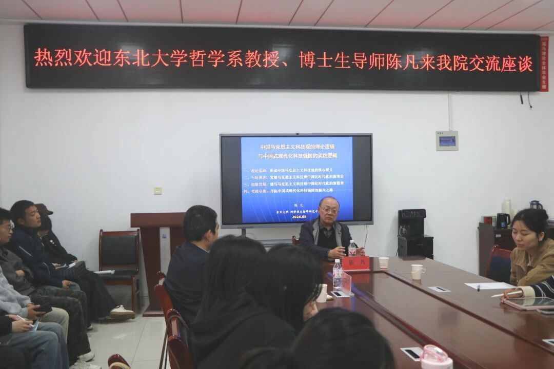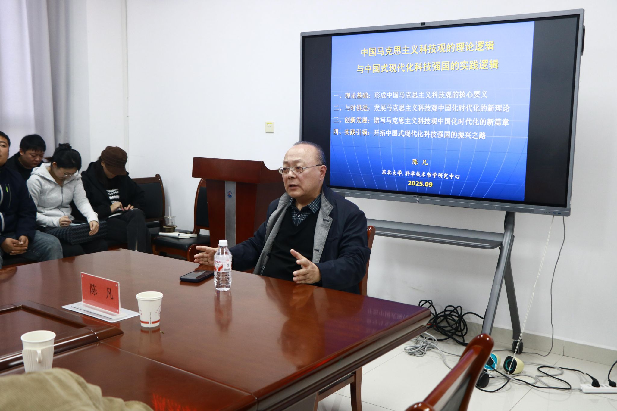 邀请东北大学陈凡教授作了题为“中国马克思主义科技观的理论逻辑与中国式现代化科技强国的实践逻辑”的专题报告。报告会在学院三楼会议室举行,马克思主义理论专业师生共同参加,报告会由学院副院长刘建华主持。