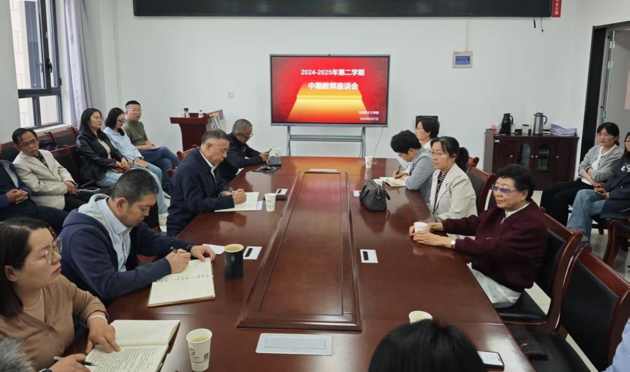 于三楼会议室召开了本学期中期教师座谈会,围绕教学现状、问题与改进措施展开深入交流。此次会议由学院领导班子成员、各系主任及全体教师共同参加,会议由院长高布权主持。