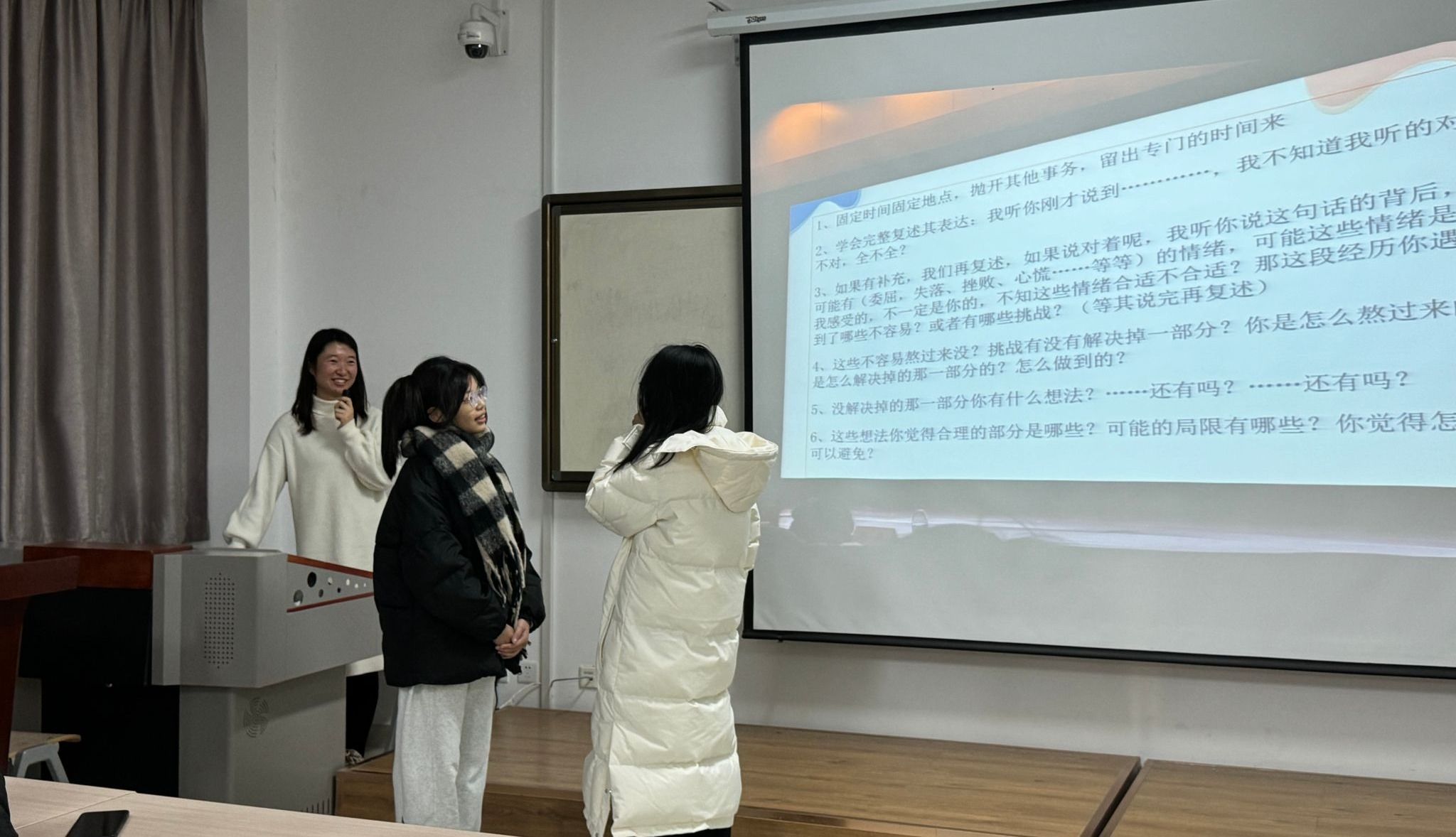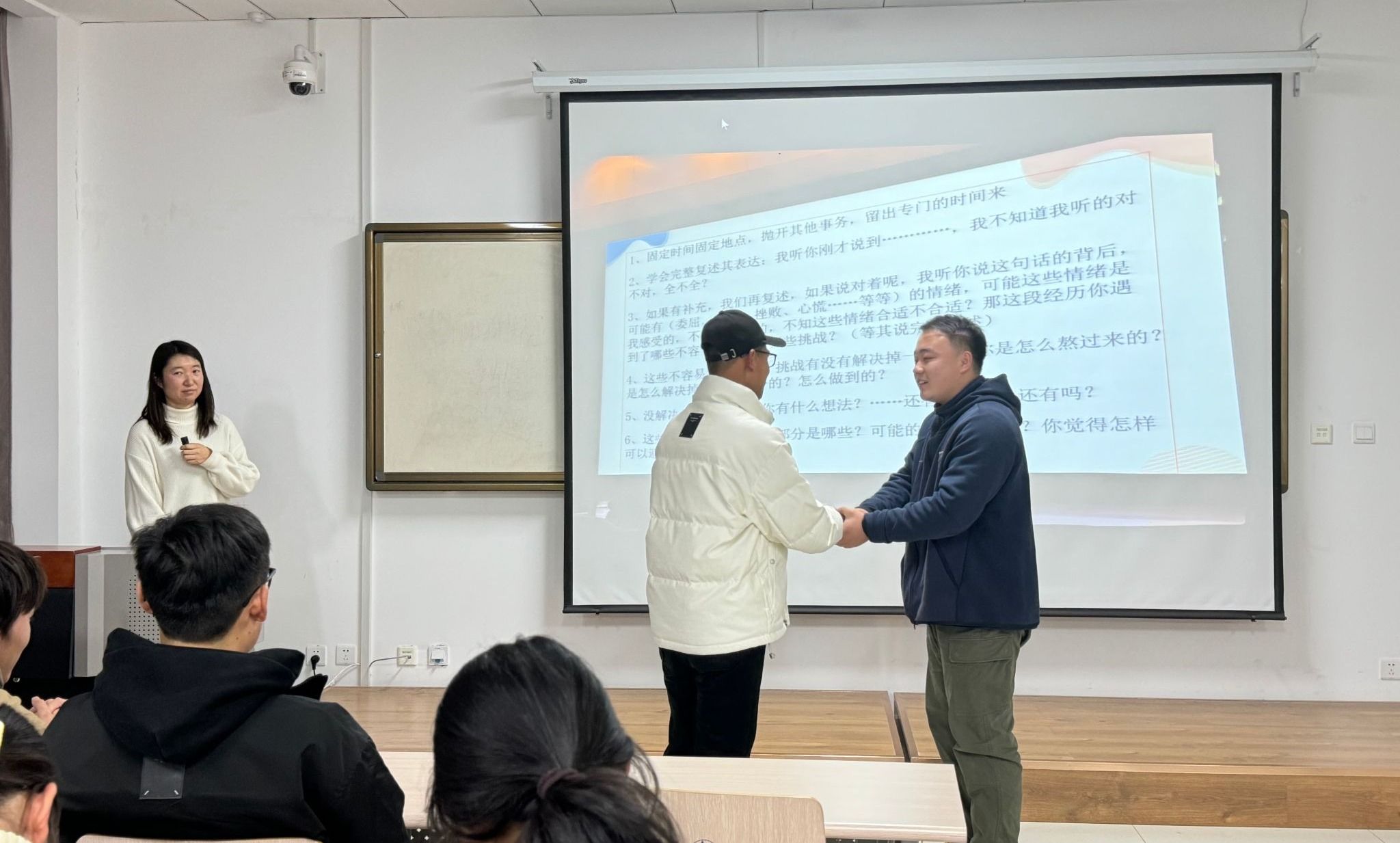 培训期间,高雨薇老师着重从心理委员与宿舍长的职责以及工作中的话术训练这两大方面展开讲解。她指明,心理委员的主要职责在于全力维护班级同学的心理健康,并协助教师宣传且开展各类心理健康教育相关活动。而在话术训练环节,高老师采用模拟对话的形式,悉心教授心理委员和宿舍长怎样以适宜的语言与态度和同学们展开沟通,同时着重强调了同理心在沟通进程中的关键作用。她还列举了一些开场白和结束语的范例,助力同学们在对话时构建信任与尊重的良好氛围。高老师积极鼓励同学们提出内心的疑问与困惑,并逐一进行了现场解答。最后,她再次强调心理委员和宿舍长是学校心理健康教育体系的重要构成部分,期望同学们持续强化学习,成为同学们更为出色的心理健康守护者。