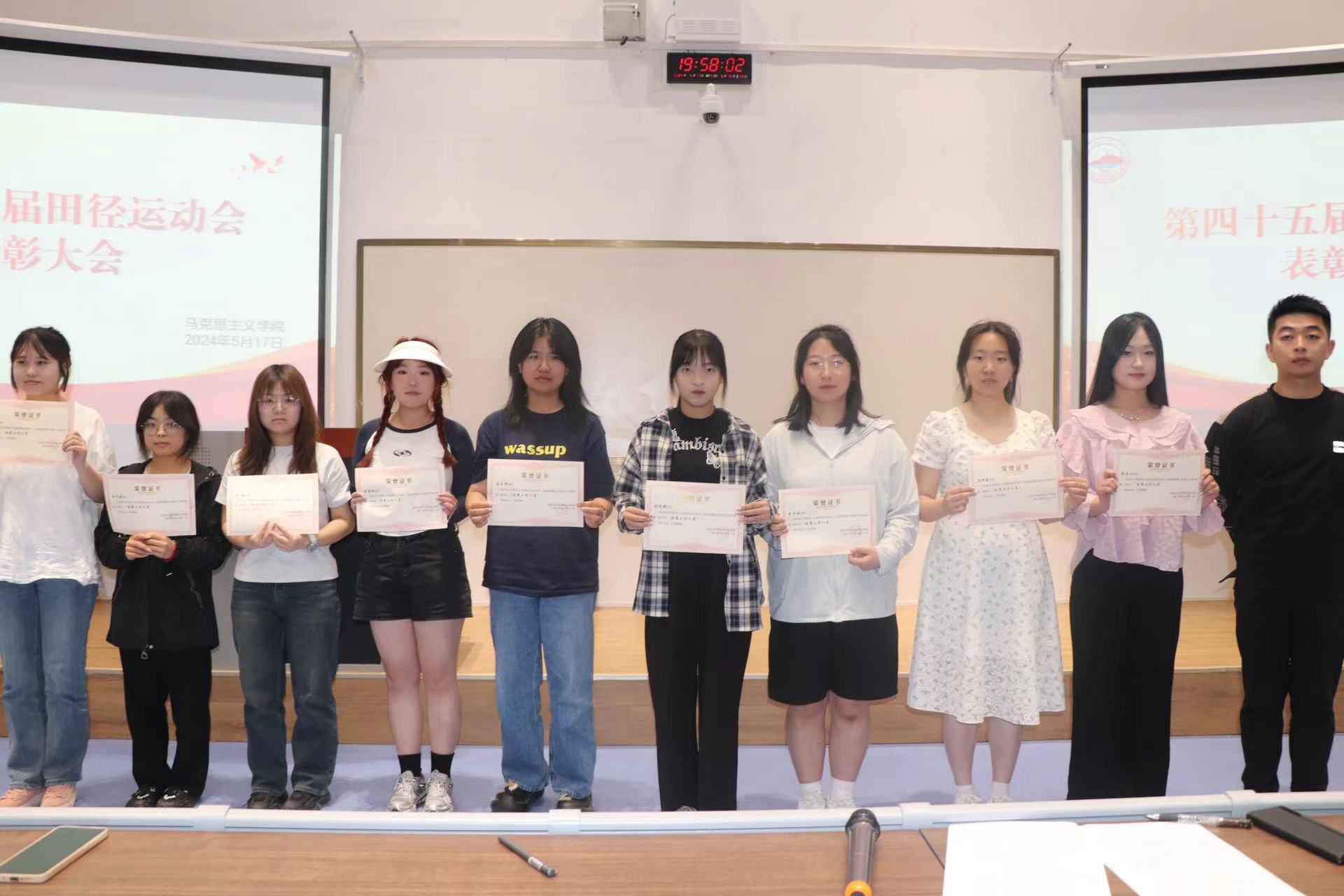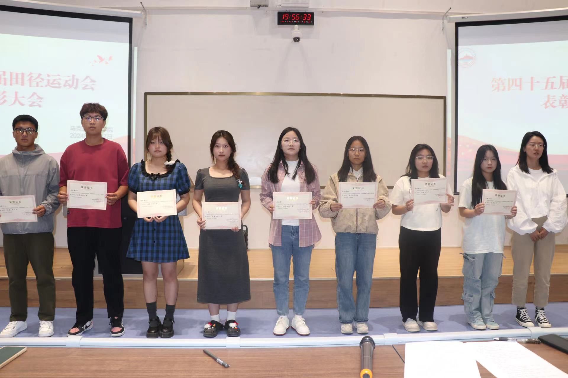 在教学楼2105举办了第四十五届田径运动会表彰大会。参加本次大会的有团委书记郭忠義老师、辅导员苗玉园老师、贺宁宁老师,学院全体参赛运动员、学生会成员、拉拉队成员及圣地青马志愿服务队成员。表彰大会由马洋同学主持。大会共有七项议程。