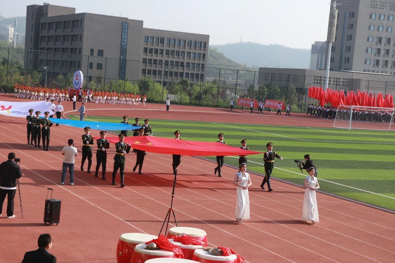 教师代表队和”小马“方阵正迈着整齐的步伐向我们走来。他们一个个昂首挺胸,朝气蓬勃。音乐声一响起,方阵队员们随着音乐节奏变换队形和动作。他们意气昂扬,队形整齐,充分展示了马院学子朝气蓬勃、团结一心的精神风貌。音乐声停,由十名同学拉动红色丝带,摆出一个鲜明的五角星,不仅展示了马院学子的独特风采,还昭示出他们的拳拳爱国之心。