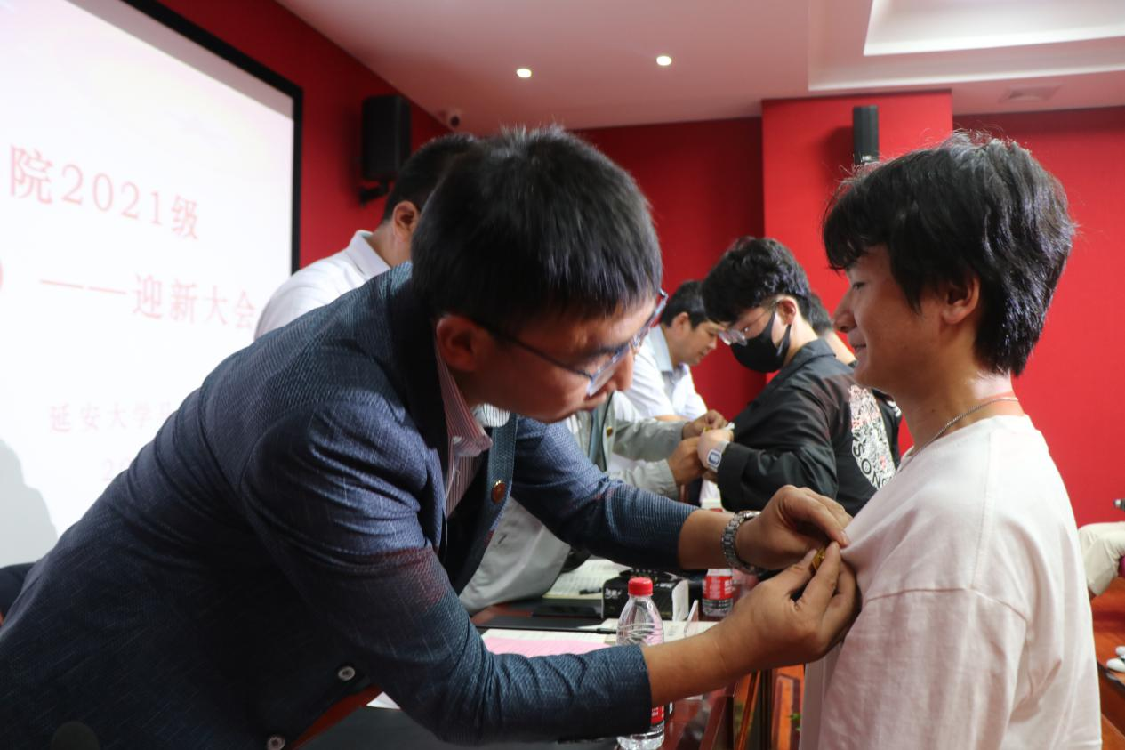 院领导为新生代表佩戴校徽、赠送《延安精神》一书。