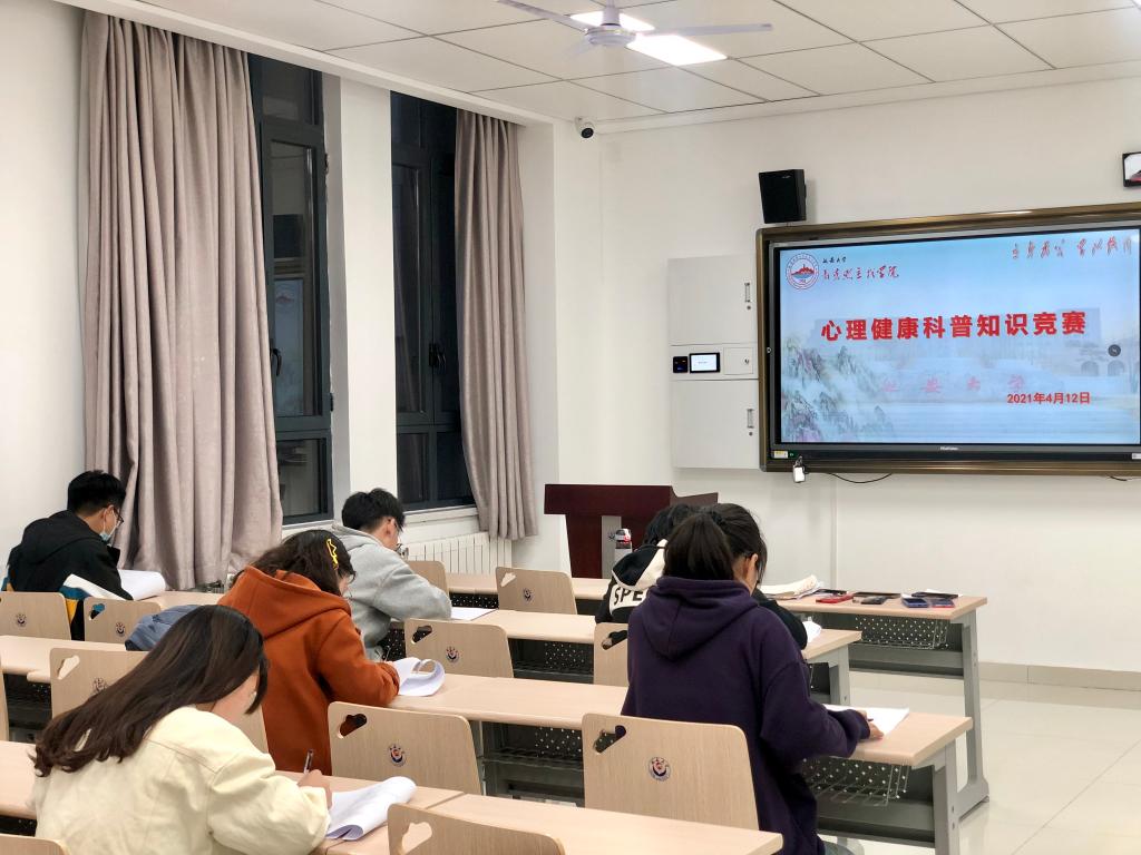 于2021年4月12日晚在202教室举办心理健康科普知识竞赛。考试试卷发下去,参赛选手立即奋笔疾书、埋头答题。一个小时左右,参赛选手陆续交卷,经过评委认真核分后,第三组:张璐娜、侯悦、訾淑慧脱颖而出,将代表91热爆