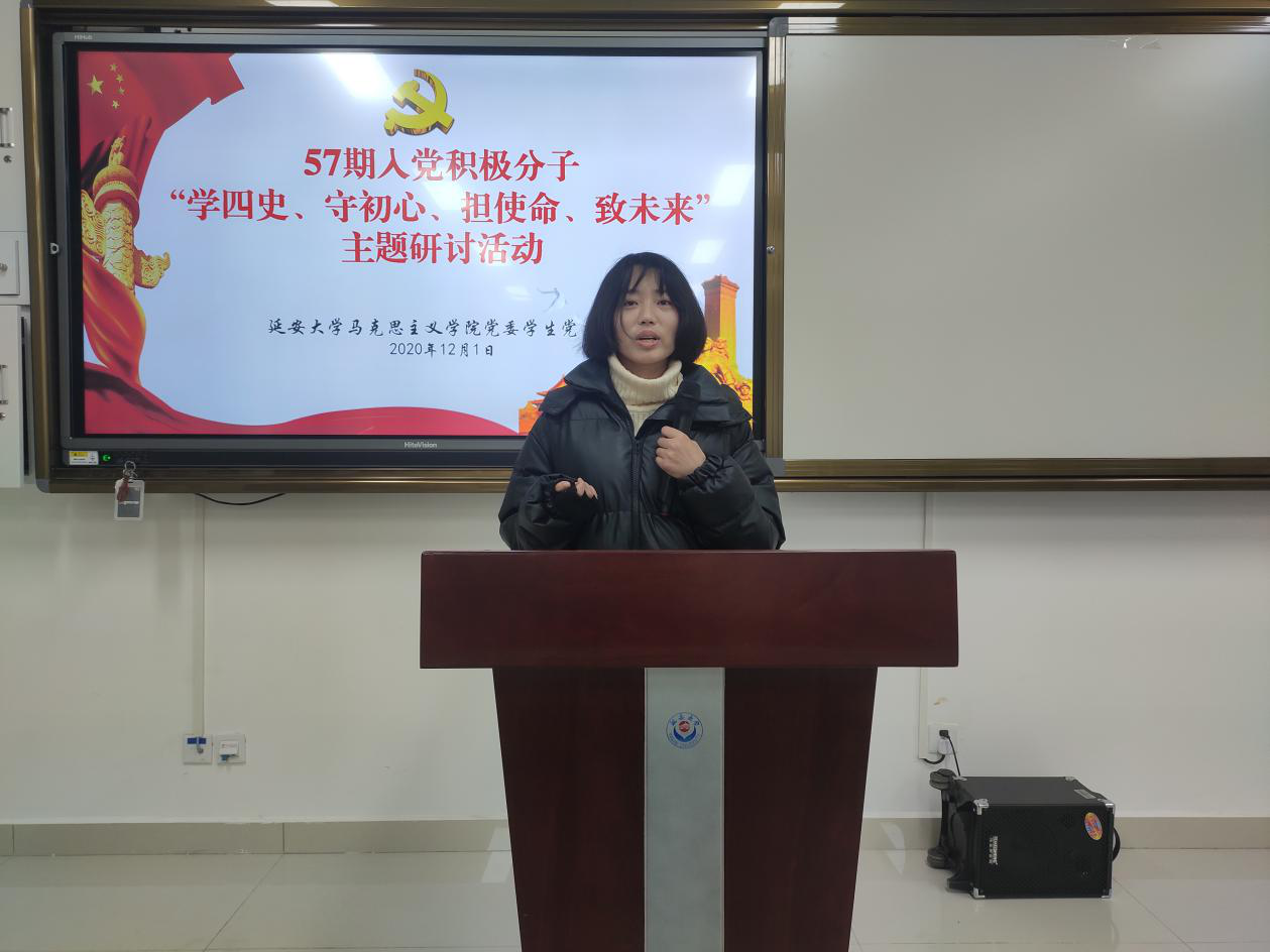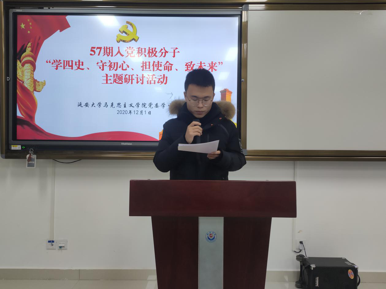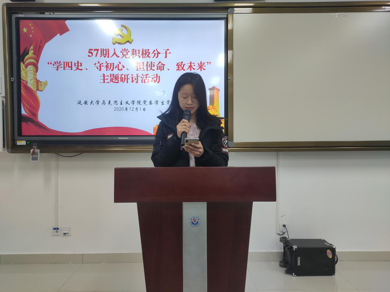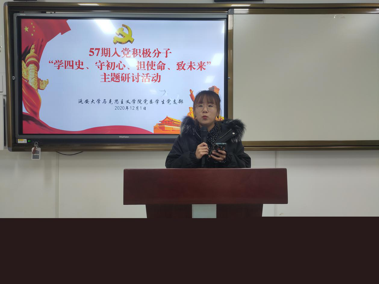 党委学生党支部组织举行了57期入党积极分子“学四史、守初心、担使命、致未来”主题研讨活动。本次主题研讨活动由“学四史、守初心”线下研讨会与“担使命、致未来”线上研讨会两部分组成。