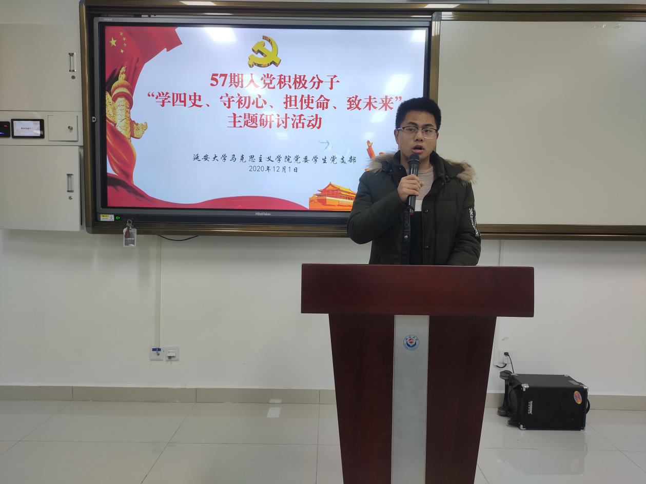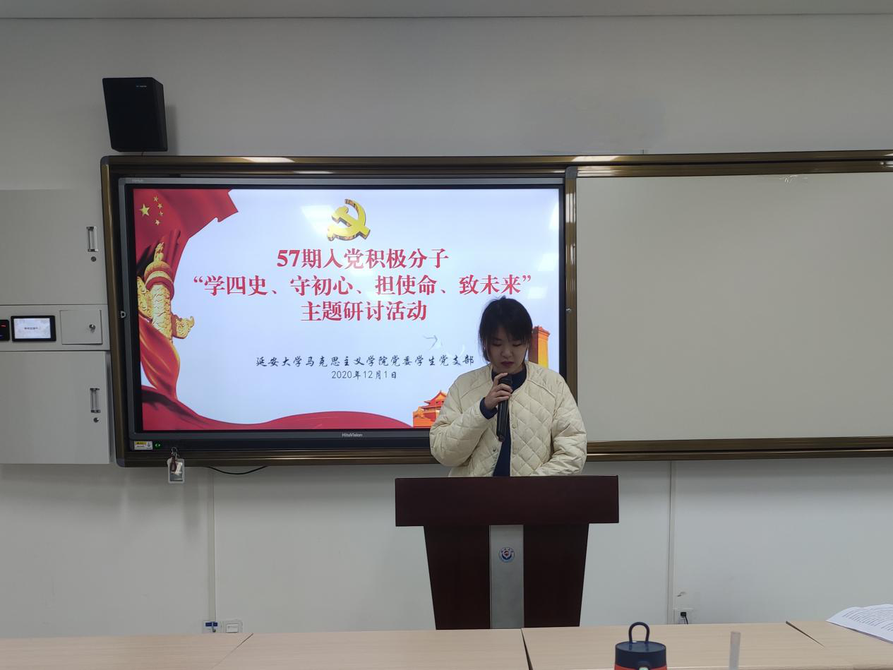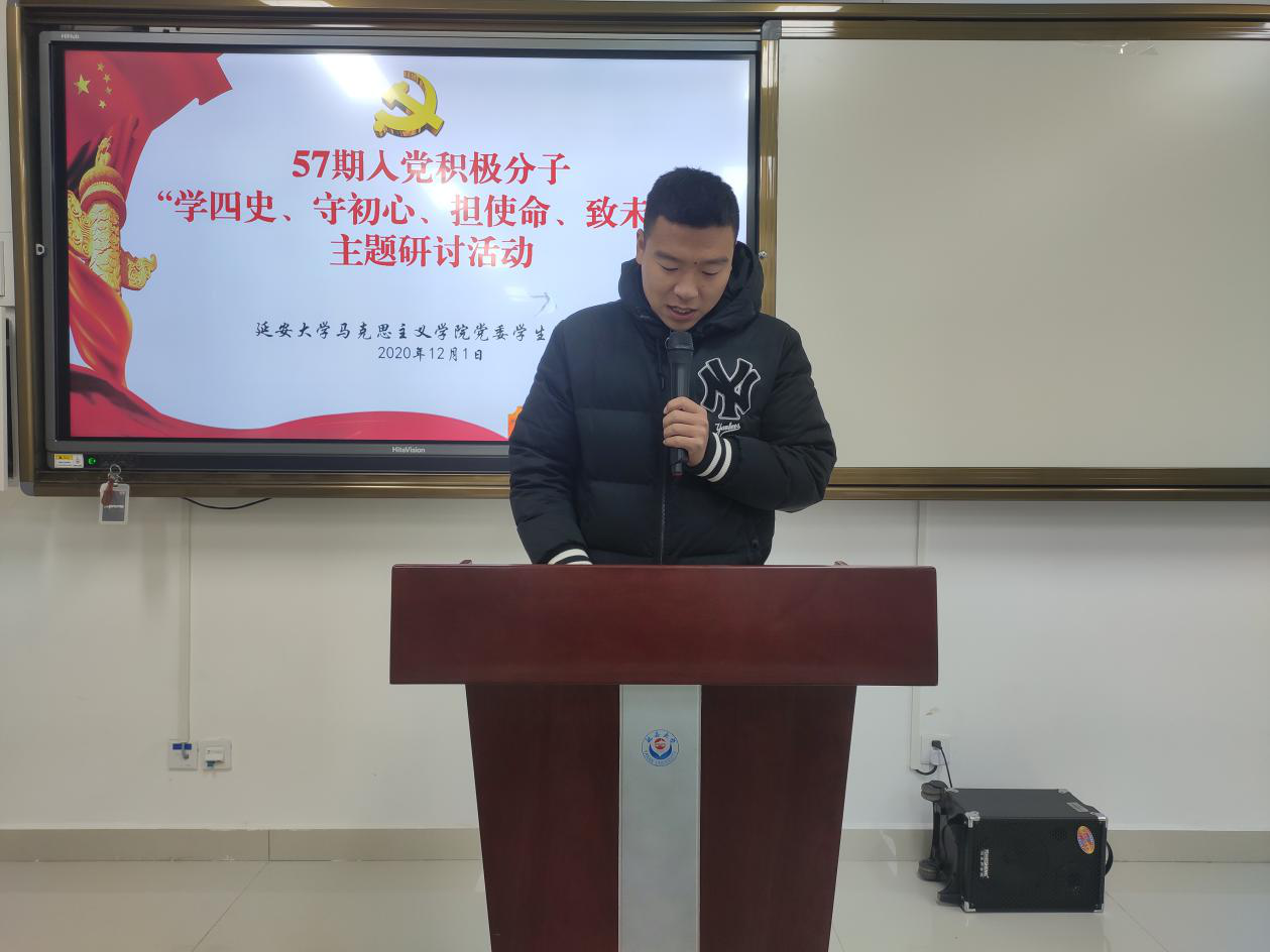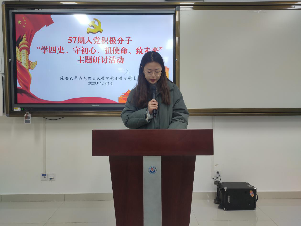 党委学生党支部组织举行了57期入党积极分子“学四史、守初心、担使命、致未来”主题研讨活动。本次主题研讨活动由“学四史、守初心”线下研讨会与“担使命、致未来”线上研讨会两部分组成。