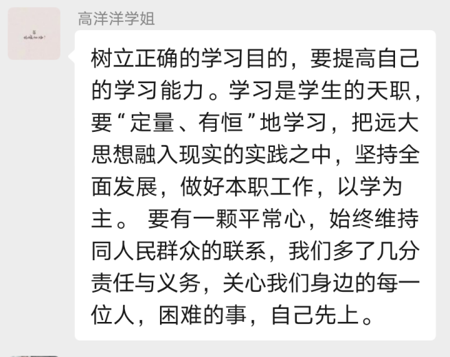 最后,贺宁宁同志对于大家的学习研讨热情表示了肯定和感谢,并希望参会同学不忘初心、牢记使命,在完成学业的同时积学习党的相关知识,坚守入党动机,时刻以一名先进党员的标准要求自己。