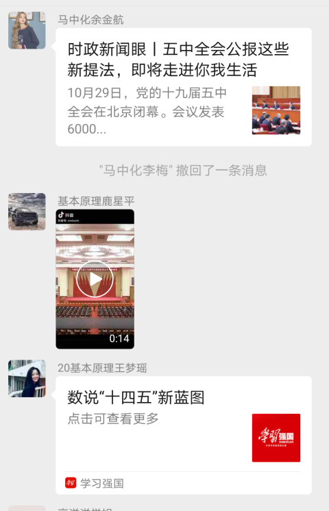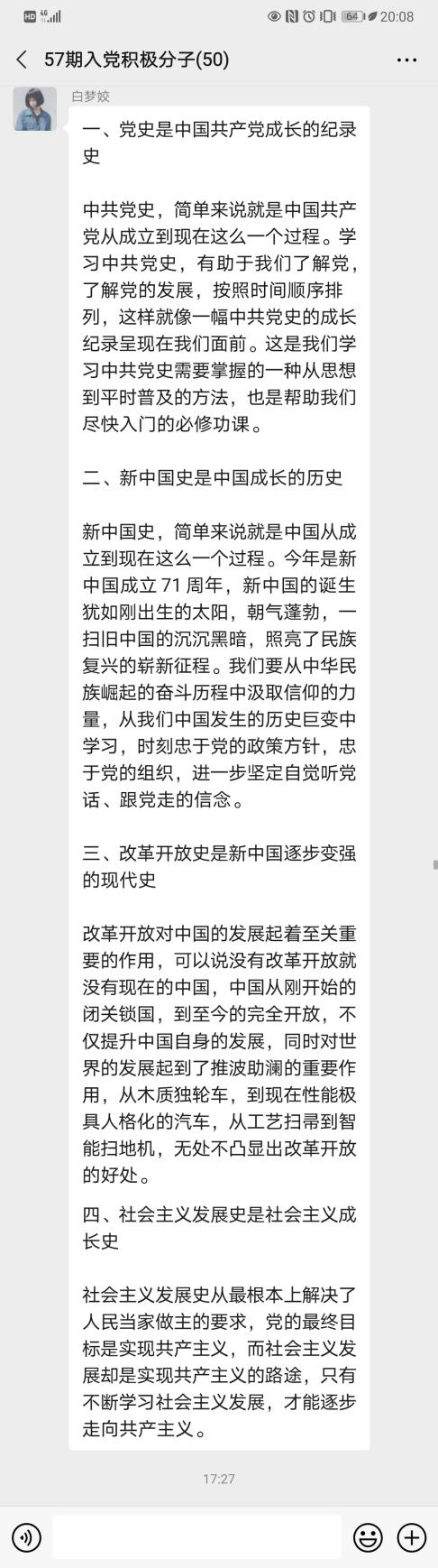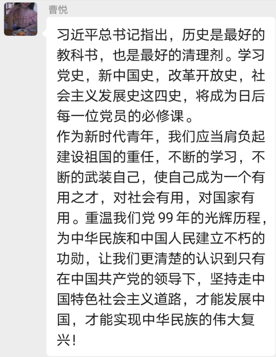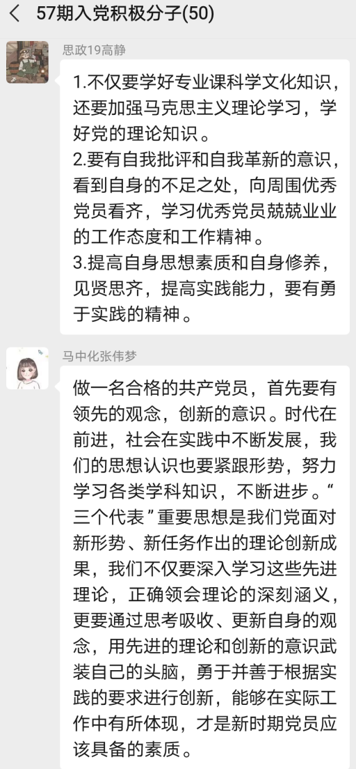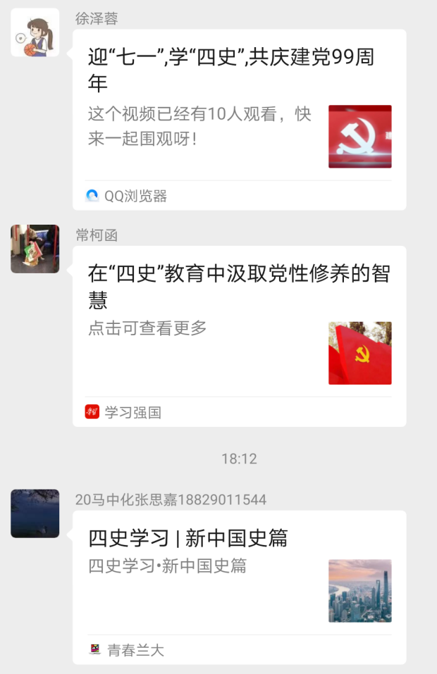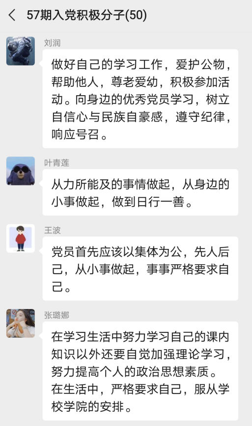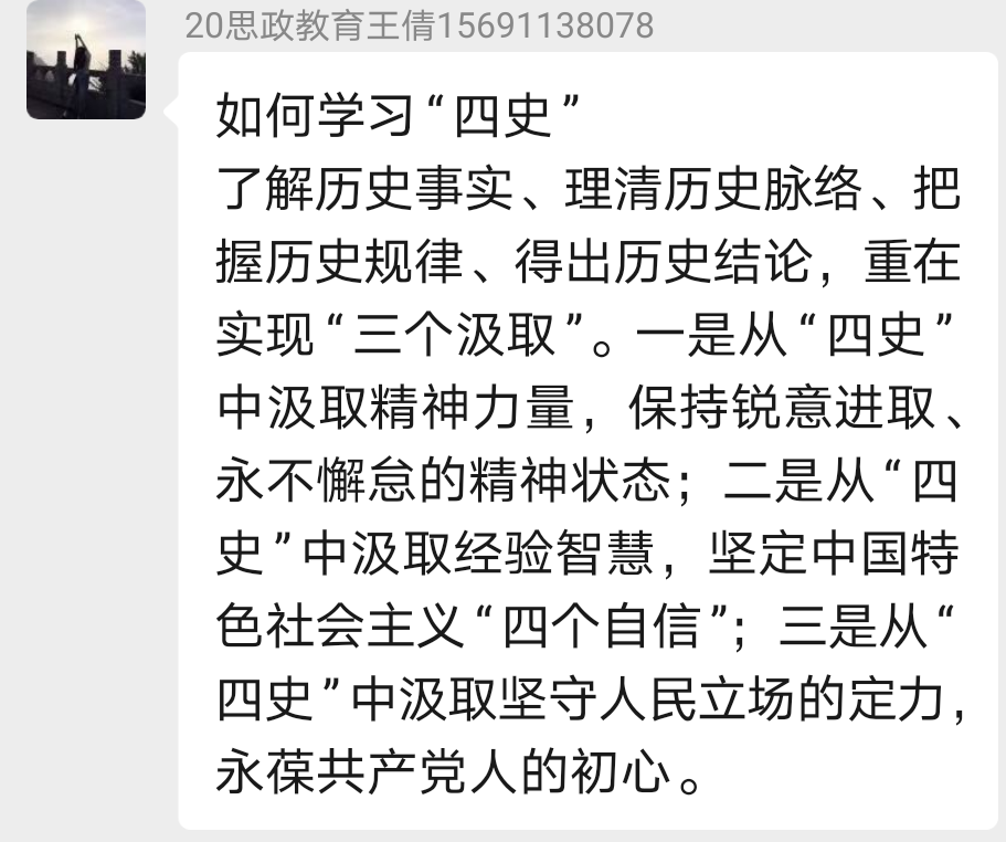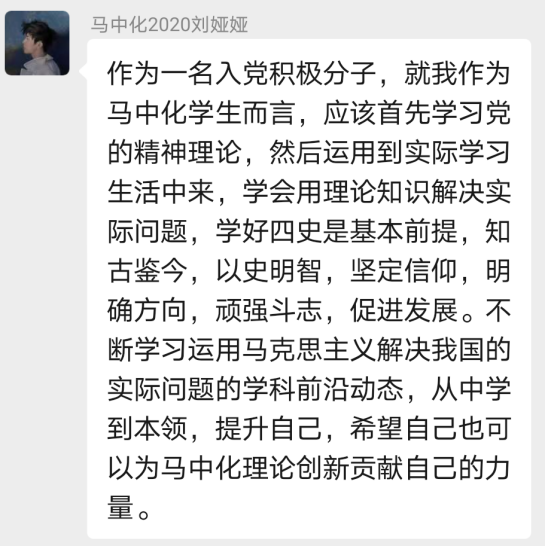 “担使命、致未来”线上研讨会于2020年12月1日在积极分子培训群举行,由学生党支部纪检委员贺宁宁同学主持。首先,由贺宁宁同志向参会积极分子介绍本次研讨内容:1、分享学“四史”心得体会;2、结合自身实际谈谈如何争做一名合格的中国共产党党员;3、分享相关主题视频及报道。