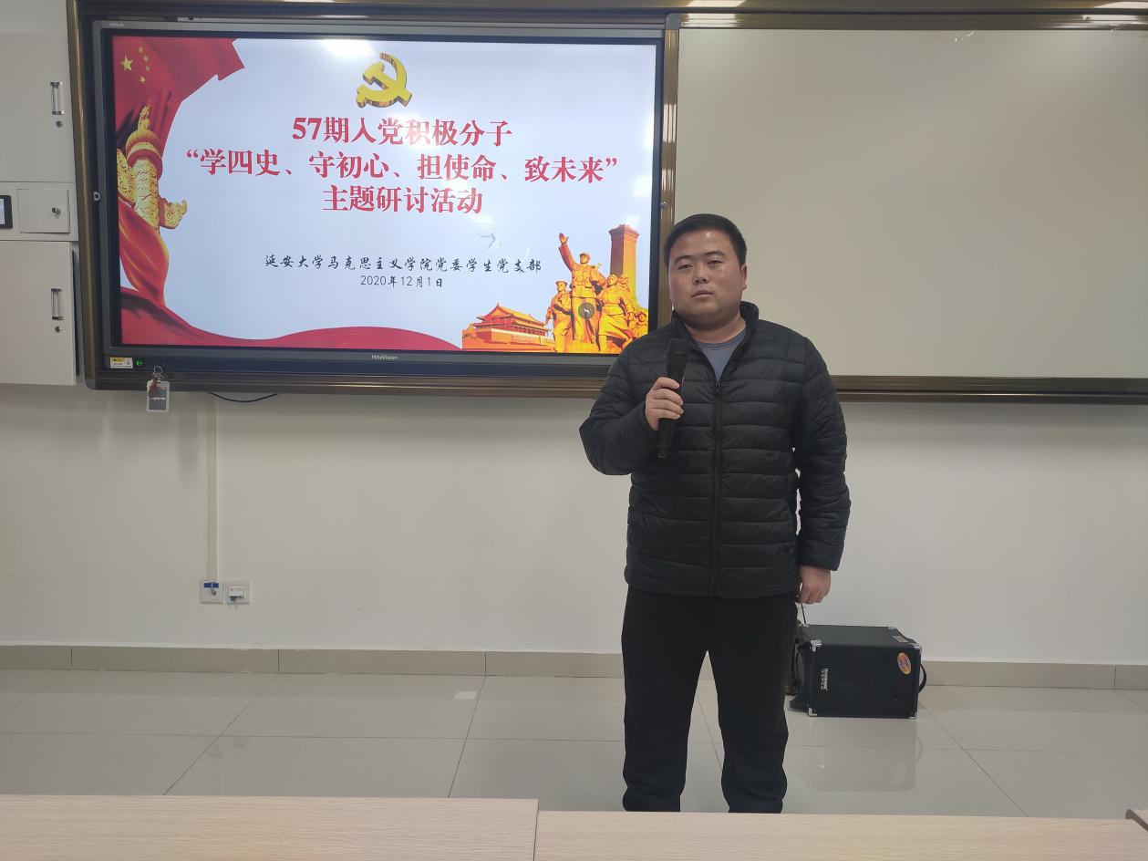 “学四史、守初心”线下研讨会于2020年12月1日在学院202教室举行,由学生党支部组织委员衣鸿飞同志主持。