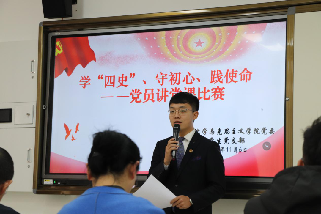 最后,赵海龙老师进行了总结讲话。他强调,全体党员、团员要进一步贯彻习近平总书记讲话精神,不断创新学习“四史”的方式方法,往深处学、往心里学,进而更好的守好初心,践行使命。另外,参赛选手要继续完善讲课内容、提升讲课水平,增强个人综合素养。
