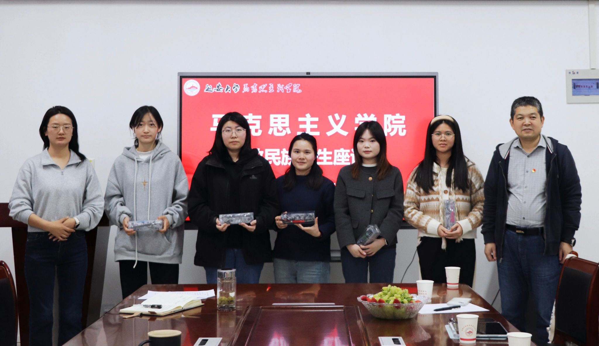 在座谈交流环节,不同地域和民族的学生代表既展现民族特色与传统风俗,又结合在校成长经历畅谈学业收获与成长体悟,更聚焦现实关切,围绕“马克思主义民族文化传承创新”“民族文化实践平台搭建”等具体问题展开探讨。苗玉园老师肯定了同学们将理论学习与实践探索相结合的研究思路,并就问题作出回应,强调要立足马克思主义唯物史观,在坚守民族文化核心价值的同时探索创新路径,在沉浸式体验中读懂民族团结进步的当代价值。
