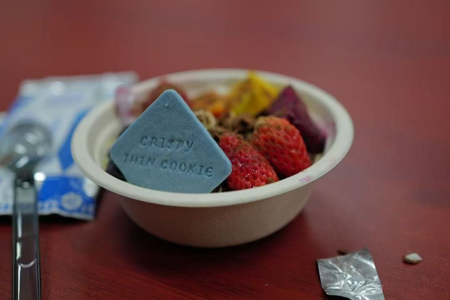以安慕希酸奶为基底,搭配每日麦果麦片、新鲜莓果、饼干碎、巴西梅粉等配料,同学们化身“心灵甜点师”:有人用芒果片拼出笑脸,命名“元气重启”,寓意用甜食驱散学业压力;有人用蓝莓与抹茶粉勾勒出“星空下的教学楼”,寄托对校园生活的热爱;还有同学在酸奶碗上贴满彩色糖珠,写下“今天的我超甜”的情绪标签。每一份作品都是独一无二的内心独白,承载着对自我的温柔对话。