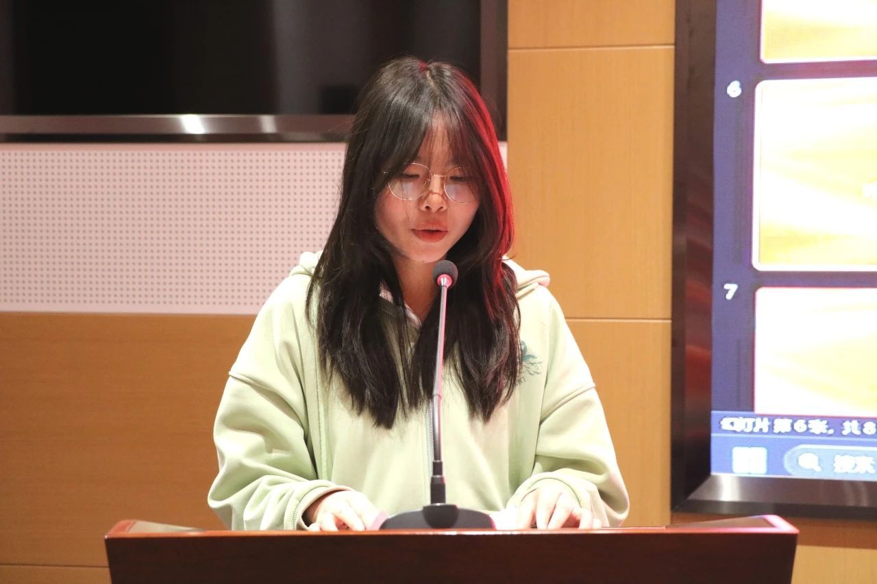 拉拉队代表24级思政王英上台发言。她满怀激情地表示,拉拉队将用热情的呐喊和精彩的表演为运动员们加油助威。她们将成为运动员们最坚实的后盾,以青春活力点燃赛事激情,为运动会营造热烈氛围,让每一位运动员都能感受到满满的支持与鼓励。