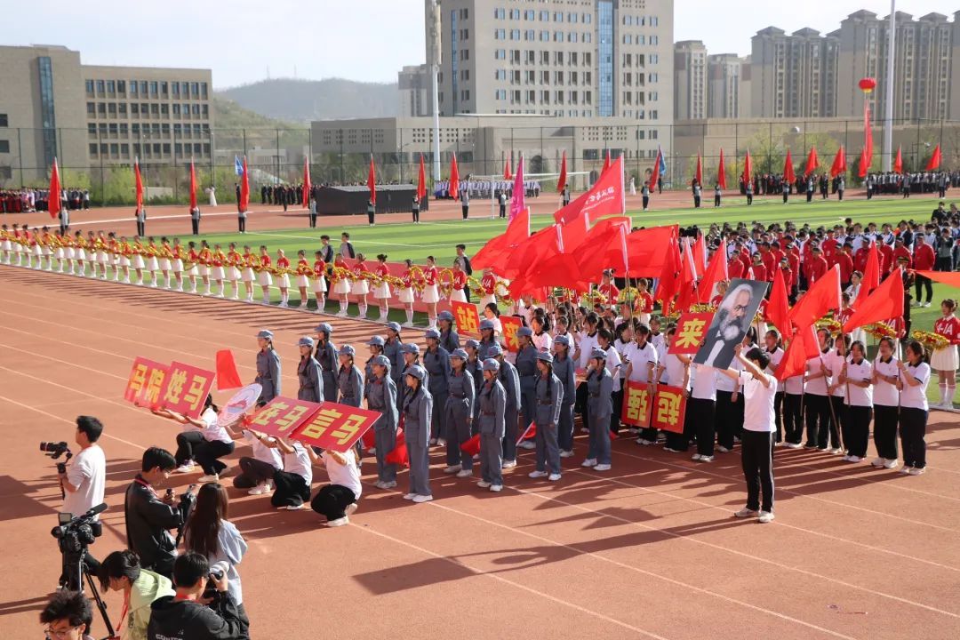 看!马院教师代表队与“小马”方阵,正迈着整齐而有力的步伐向我们走来。伴随激昂的音乐声响起,方阵中红旗队伍如灵动的火焰,迅速且有序地变换着队列,在红旗的簇拥下,一幅巨大的马克思像于真理的篝火中缓缓浮现。队员们意气昂扬,神情庄重而自豪,充分展示了马院学子朝气蓬勃、团结一心的精神风貌。“肩鸿任钜踏歌行,功不唐捐玉汝成。”马院学子致敬思想伟人,将怀揣践行时代使命的坚定决心,以青年奋斗之力,续写辉煌新征程。