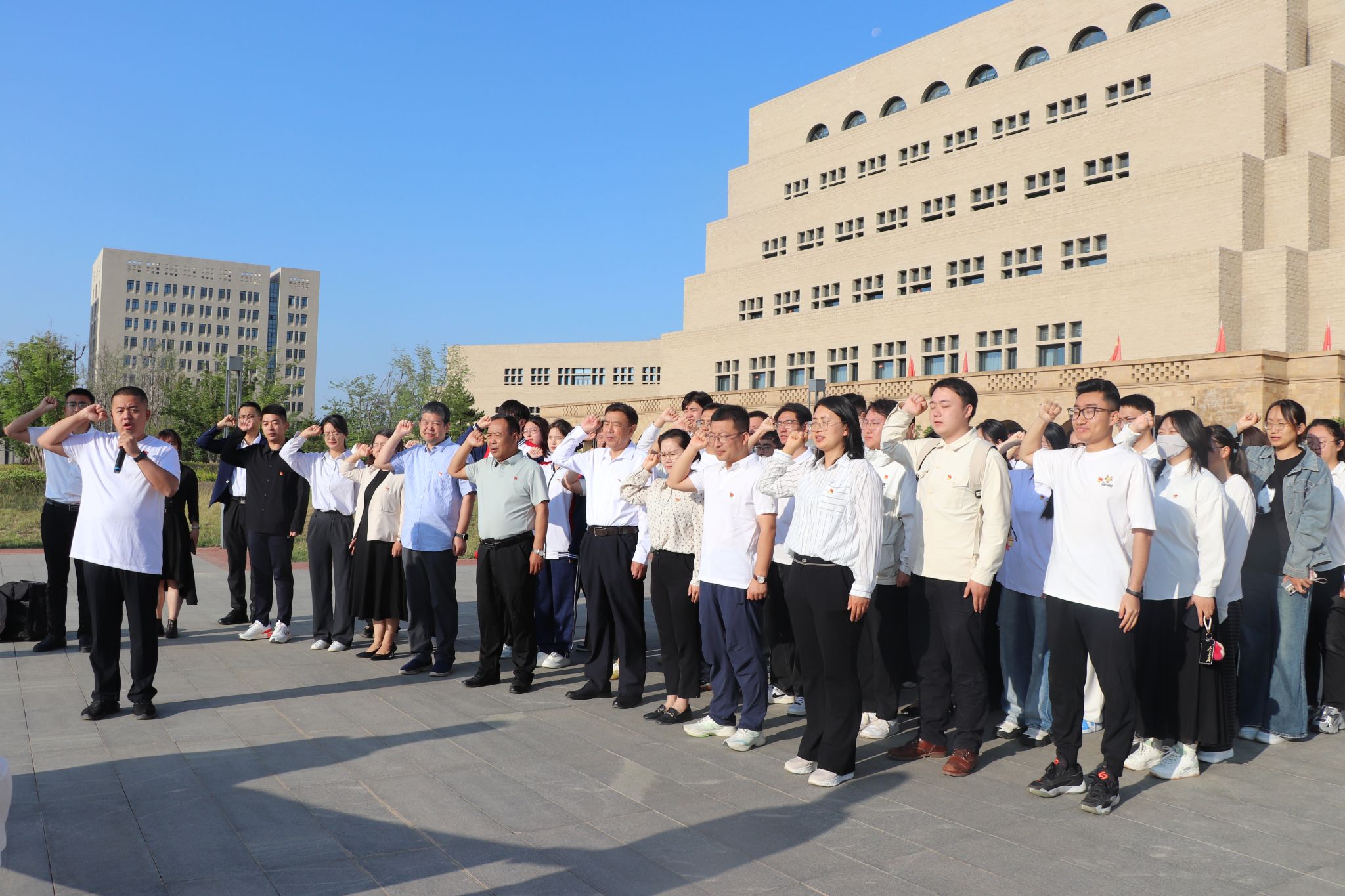 全场师生合唱校歌,激昂的旋律回荡在校园,凝聚着全体毕业生对母校的深厚情谊与对未来的无限憧憬。最后,全体毕业生党员在田旭阳同学带领下面向党旗庄严宣誓,重温入党誓词,彰显了党员坚守信仰、砥砺前行的坚定决心。
