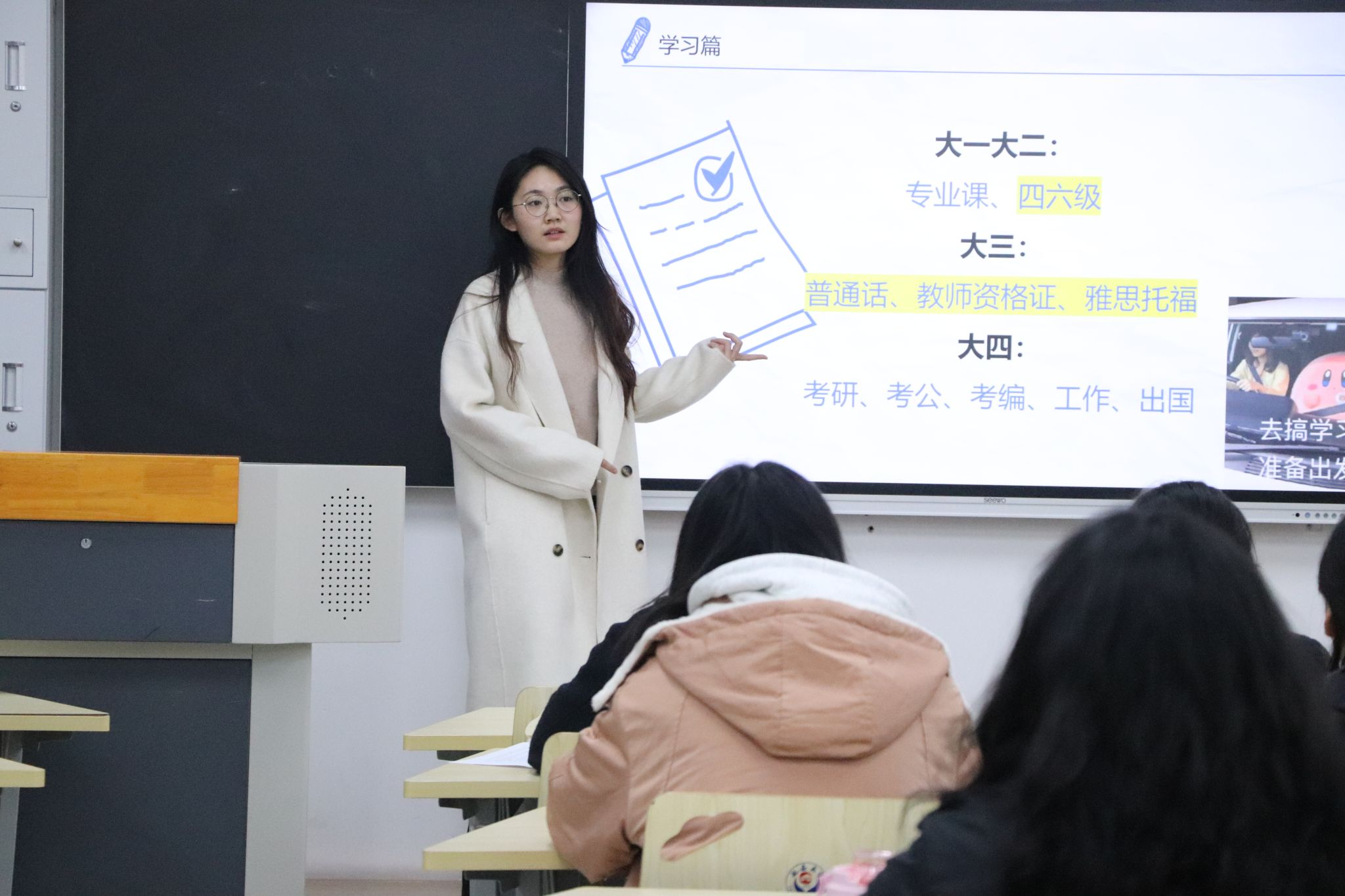 分享会上,李齐飞同学围绕“学习、工作、生活、规划”四大主题与同学们进行了经验交流。在学习上,她细致梳理了大学四年的关键任务,特别强调要善于利用碎片化时间进行记忆与复习。在工作上,她结合自身担任学生干部的经历,告诉同学们要找准学习与工作之间的平衡点。在生活上,她鼓励同学们积极与老师、同学和学长学姐交流,构建和谐融洽的人际关系网。在规划上,她提出要学会目标分解,比如大一打好基础、大二积累经验、大三明确方向,大四最后冲刺。