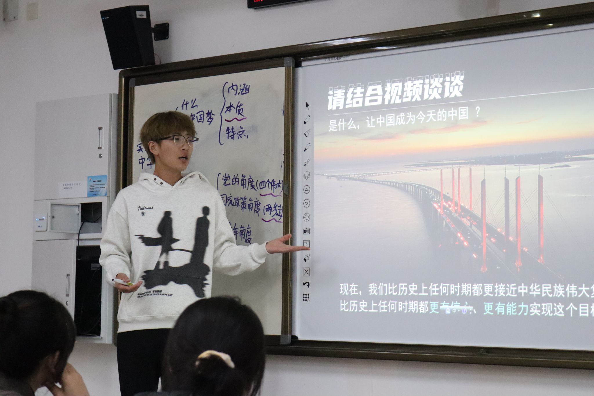 活动前,按照规则和程序将班级同学分为12个小组,12名公费师范生分别担任组长。在组长的带领下,组内同学分工合作,从初高中思政课课程中选定了教学内容,并针对教学目标设定、教学重点拆解、教学素材准备、板书逻辑设计、教学流程规划等进行了为期两周的反复打磨,最终每组选定1名成员代表参与比拼活动。