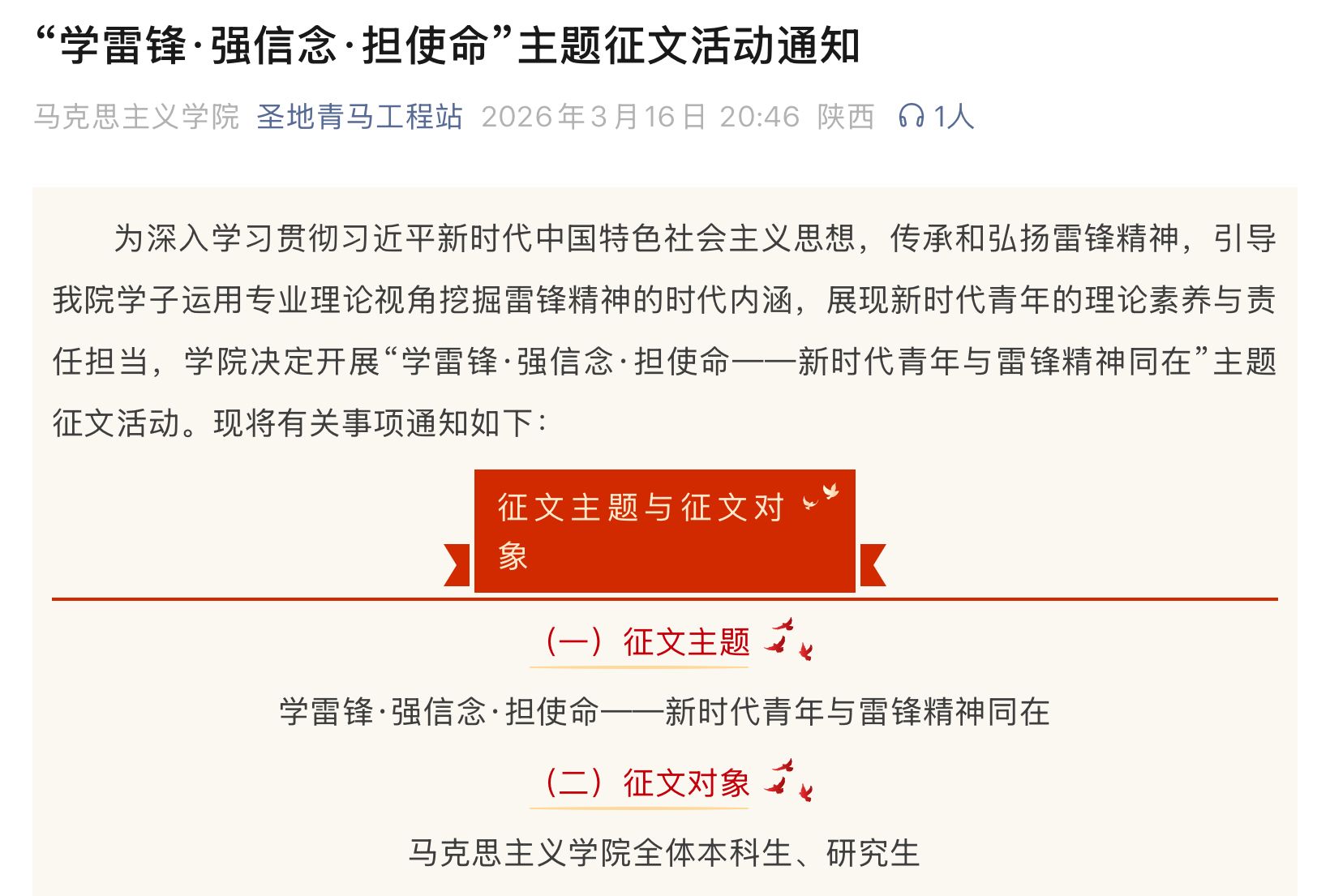 学院紧扣“学雷锋·强信念·担使命”主题,面向全体学生开展主题征文活动。学子们充分发挥自身专业优势,深入阐释了雷锋精神蕴含的人民立场、实践导向等。一篇篇文章展现了思想的深度与青春的热度,同学们在理论思辨中深化了认知,在文字激扬中凝聚共识,进一步筑牢了投身志愿服务、担当时代使命的思想根基。