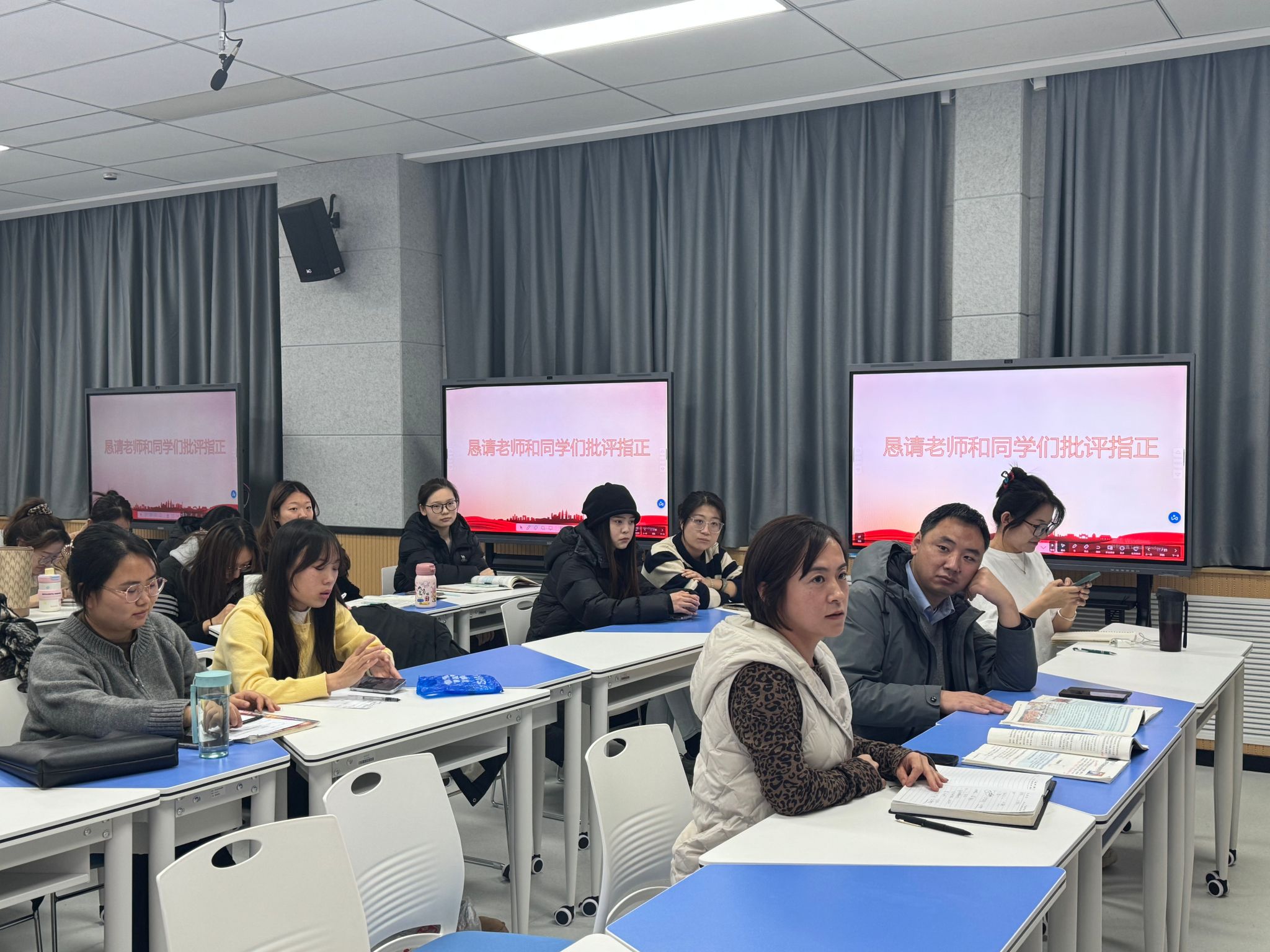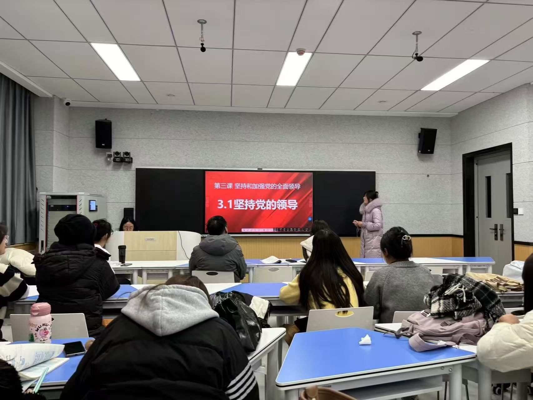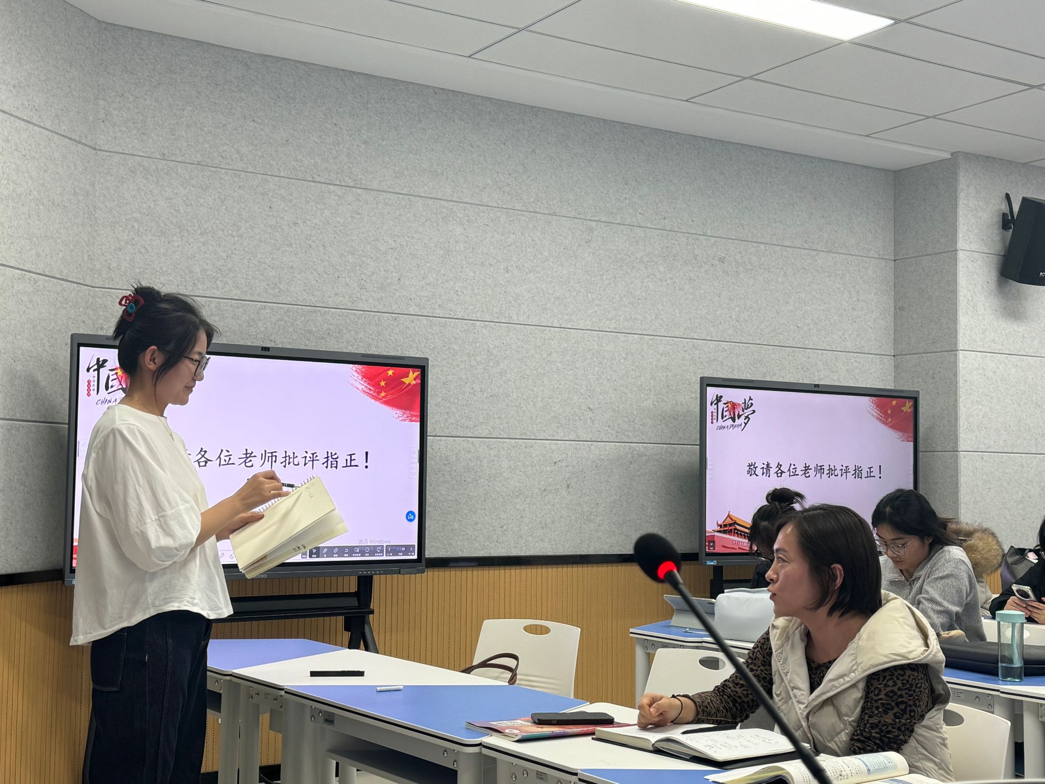 202多功能智慧教室开展了教学技能实训的第六期活动。本期活动讲课人为翟苗苗和王悦同学,两位同学讲课的内容分别是高中政治《坚持党的领导》和《实现中华民族的伟大复兴》。本次活动邀请闫莉莉老师和魏志远老师做点评。