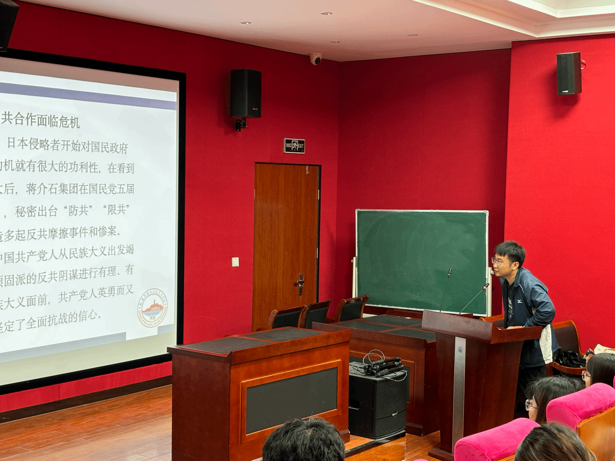 第一位导读人是水浩田同学,他从《中国革命和中国共产党》的写作背景、主要内容、理论价值与现实意义等几方面展开系统阐述,并将本文与《新民主主义论》进行了对比研究。首先,他从三个方面讲解了《中国革命与中国共产党》的写作背景,分别是抗日战争进入战略相持阶段,国共合作面临危机;国统区个人主义,一党专政盛行;中国革命面临理论困惑。其次,着重阐述了这篇文章的主要内容。本文以中国社会性质为立足点分析了中国革命的对象、任务、动力、性质和前途,并指出中国共产党要承担起领导中国民主主义革命和中国社会主义革命彻底完成的责任。紧接着,将《中国革命和中国共产党》与《新民主主义论》两篇文章进行了比较阅读,介绍了了两篇文章之间的关联并指出两篇文章在内容和侧重点方面的不同。最后,介绍了这篇文章的理论价值和现实意义。水浩田同学指出,本文具有指导中国革命走向胜利的行动指南、进一步丰富和发展了马克思主义学说的双重理论价值,以及要尊重农民的主体地位、要以自我革命推动党的建设、要始终坚持坚持实事求是的思想路线的现实启示。