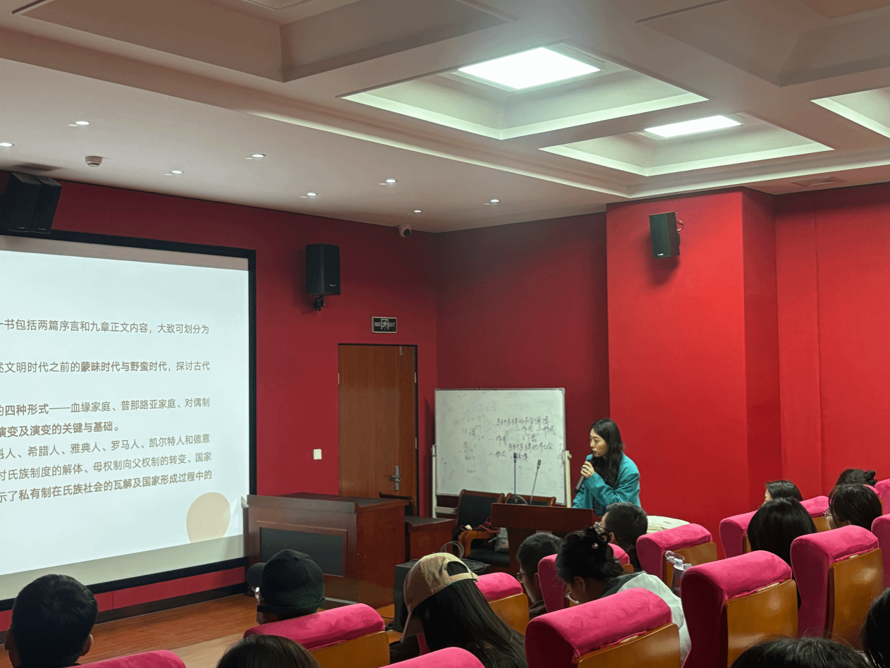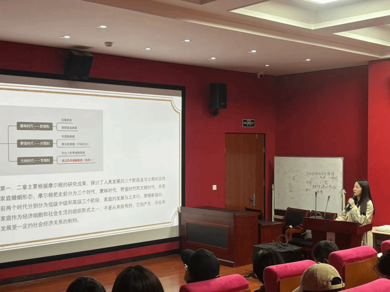 一楼多功能厅举行。本次读书活动由硕士研究生拓蕴琦、何怡林、王姣三位同学作报告分享,研读的内容是马克思恩格斯经典著作《家庭、私有制和国家的起源》。刘建华老师、谭亮亮老师对三位同学的报告内容进行了理论指导并提出了一些建议。