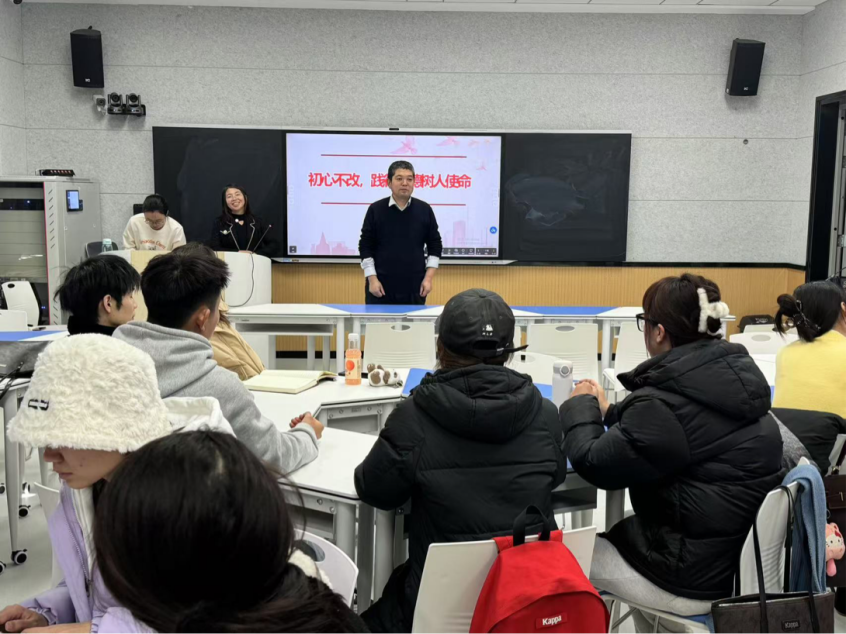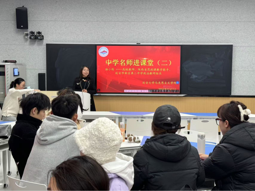 学科教学(思政)全体研究生对中学思政课的认知与理解,帮助他们积累教学经验,提高教育教学水平,为未来成为一名优秀的中学政治教师打下坚实基础,中学名师进课堂第二期于12月8日邀请延安市新区第二中学的拓小玲老师发表以“初心不改,践行立德树人使命”的主题报告,传授思政课教学知识,本次活动由刘建华副院长主持。