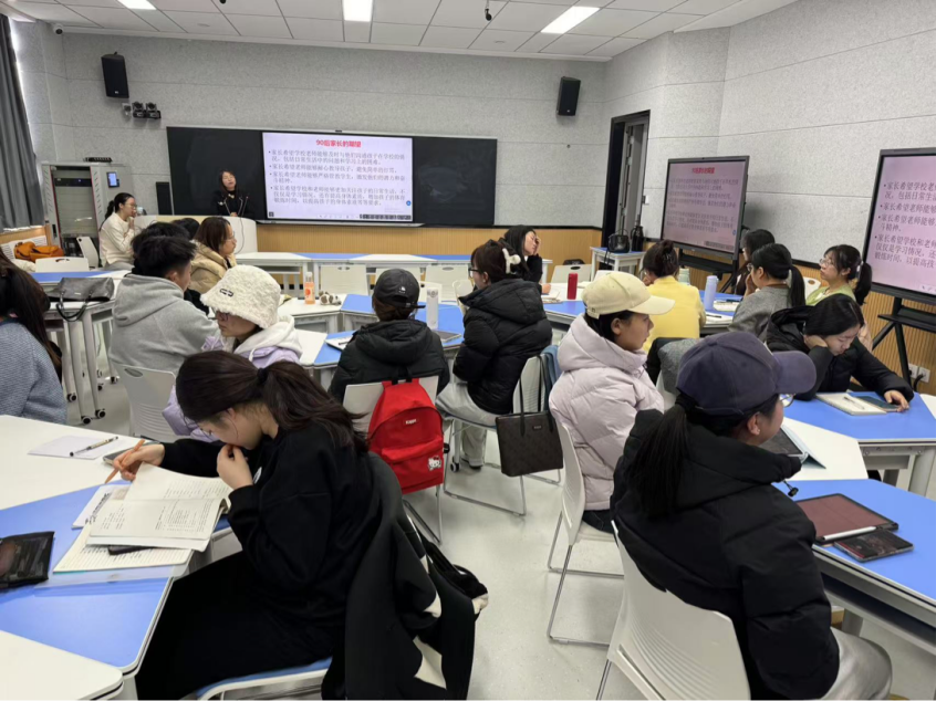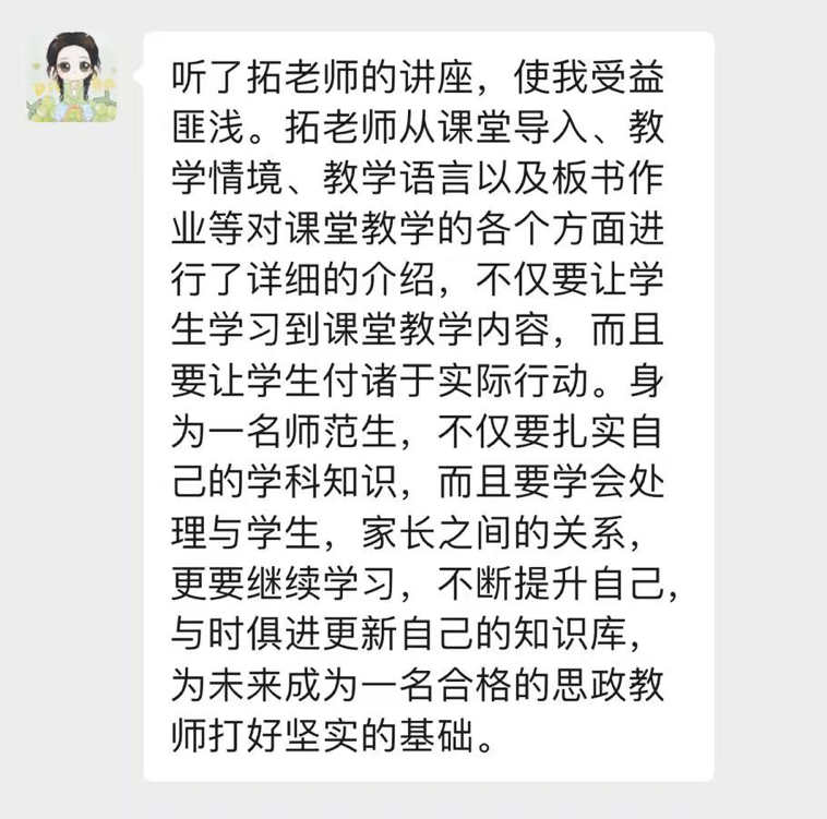 拓老师首先提出要培养堪当民族复兴大任时代新人,不仅是实现中华民族伟大复兴的必然要求,也是推动国家发展、社会进步和个人成长的重要举措。其次提出要潜心育人、静待花开。分析了90后家长的期待高以及10后孩子的特点,为学生日后在教学和处理家校关系方面提供了宝贵的经验。最后提出躬耕教育、担当使命。从巧妙导课、教学情景、语言设计以及分层作业等多个方面教会学生如何做到精心备课、有效上课。