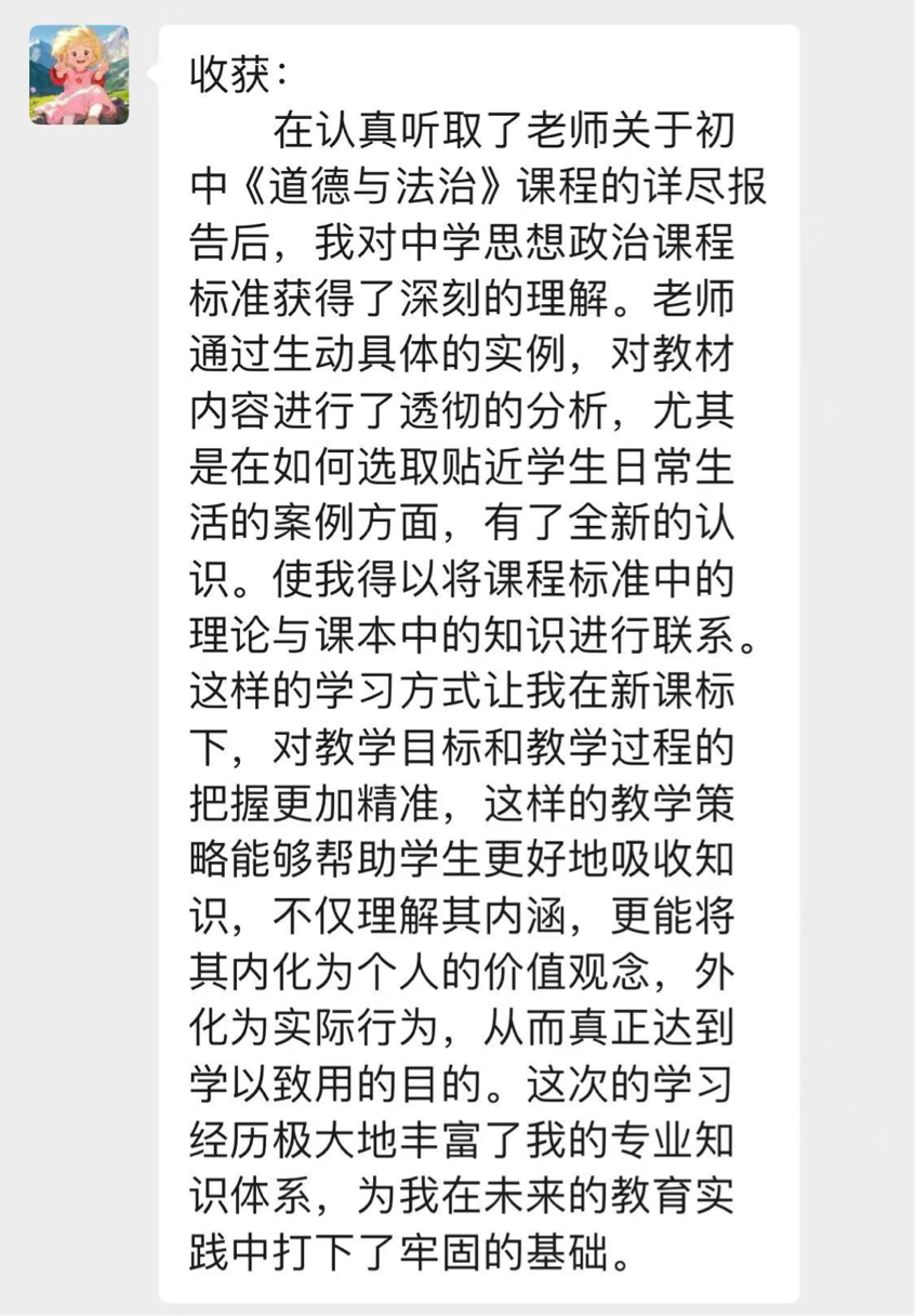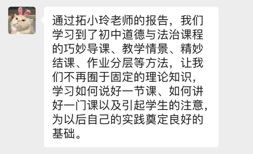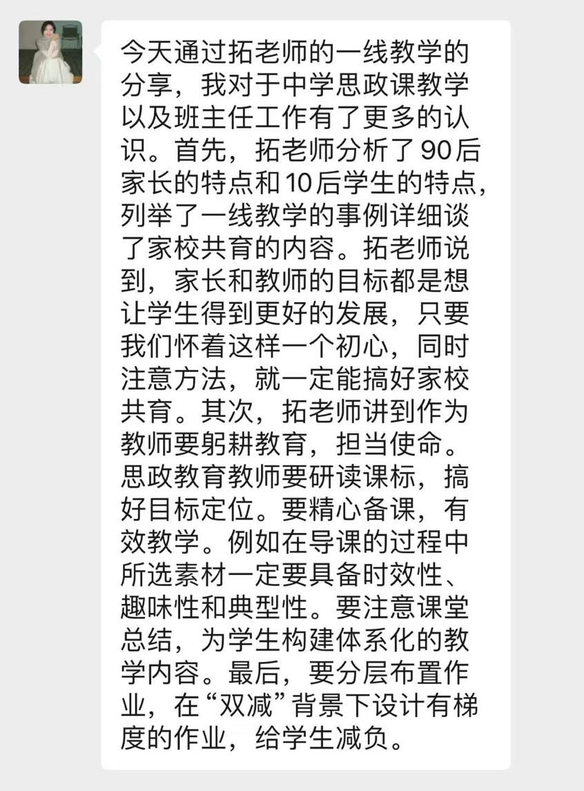 拓老师强调教育不是小事,它关乎着青少年精神世界的塑造。解决好培养什么人、怎样培养人,为谁培养人这个根本问题。在这个根本问题上,必须旗帜鲜明,毫不含糊。这就要求我们把下一代教育好、培养好,从学校抓起、从娃娃抓起。作为一线思政教师,初心不改,担当使命,既要仰望星空,又要脚踏实地,前行路漫漫,努力方灿灿!
