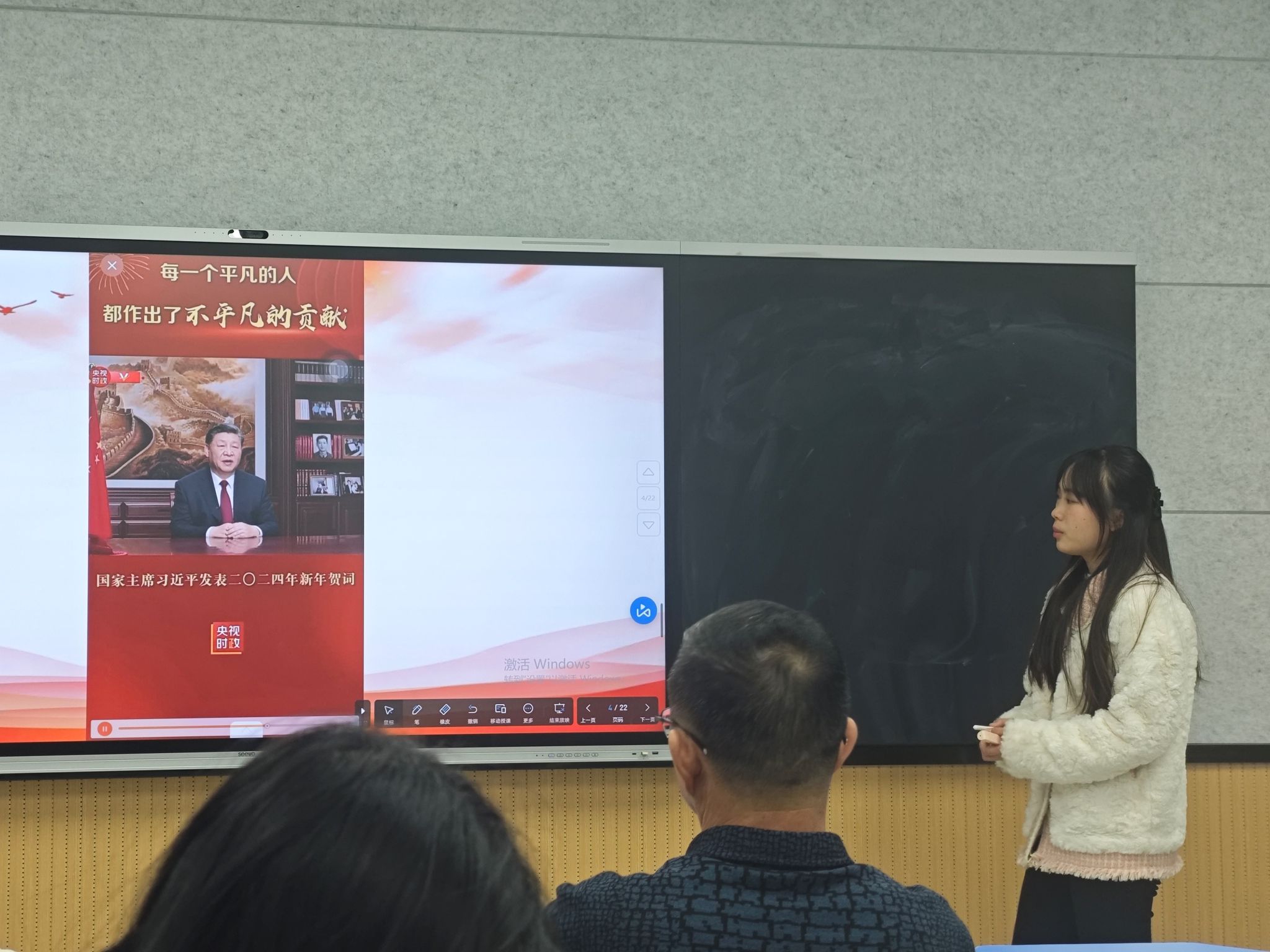 薛雨哲同学试讲的内容是《价值的创造与实现》。课堂伊始,她以三幅图片和习近平总书记在2024年新年贺词视频为导入,进入总议题“为何平凡铸就伟大”,并开始讲述“价值的创造与实现”的课程内容。三个分议题主要以习近平总书记点赞过的三个平凡英雄展开,让学生知道在劳动和奉献中创造和实现价值、在个人和社会的统一中创造和实现价值和在砥砺自我中创造和实现价值。