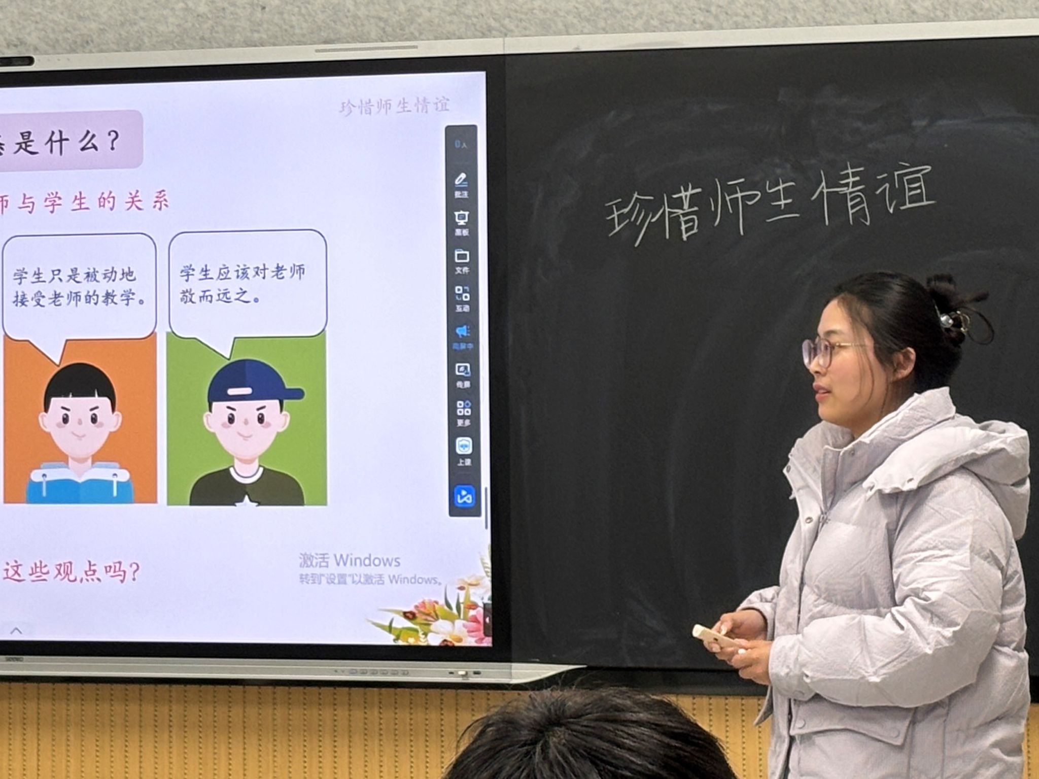 姜含笑同学试讲的内容是《珍惜师生情谊》。她通过一段“束脩之礼”的视频开始了本节课的教学内容。通过案例,使学生认识到彼此尊重、教学相长、携手共进是师生交往理想而美好的状态。紧接着她通过播放张桂梅与同学们日常相处的视频,引出师生应该怎样建立良好的师生关系,要怎样去珍惜这份师生情谊。总之,珍惜师生情谊,需要我们在日常的点滴相处中用心去体会、用行动去维护,这样才能让师生关系更加和谐美好,为我们的学习与成长创造良好的环境与氛围。