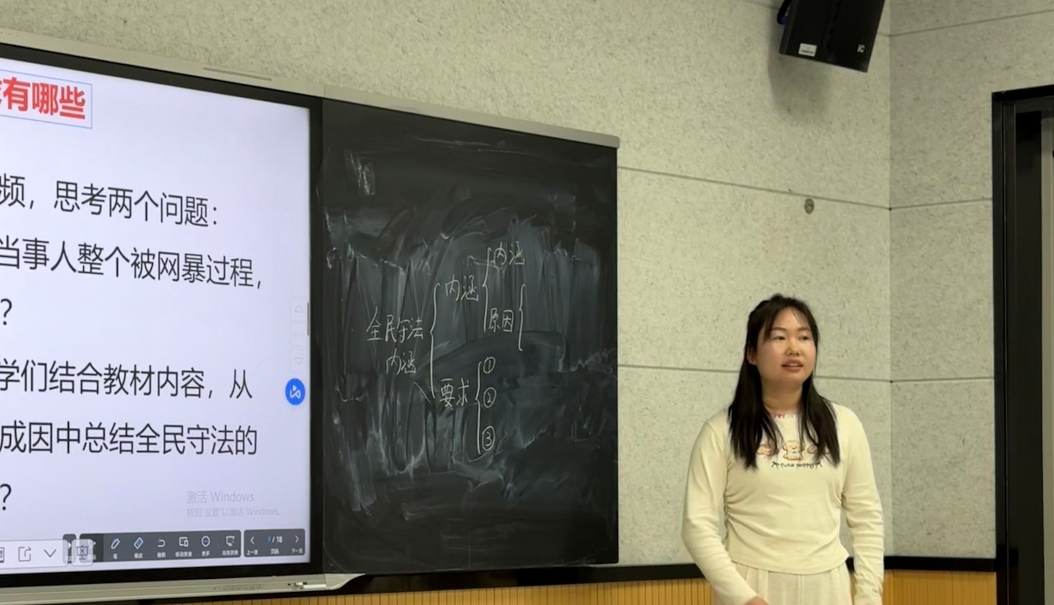 202智慧教室开展了第十七期教学技能实训活动。本次活动讲课人为何埝埝和柏昭君两位同学。讲课的内容分别是高中政治必修三《政治与法治》第三单元第九课第四框《全民守法》和初中政治七年级下册第五课第一节《我们的情感世界》。