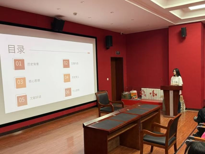 第三位分享人姬书雅对毛选第二卷中的《<共产党人>发刊词》进行阅读分享,主要从创作背景、核心内容、历史价值、现实启示以及文献综述五个方面进行分享。首先她从剧烈动荡的国际局势和民族矛盾与阶级矛盾交织的国内形势入手,讲解了篇目整个的创作背景,引出此篇目的创作目的。其次,她向我们详细解读了三大法宝的内涵以及关系,正确理解和把握统一战线、武装斗争和党的建设这三个法宝及其相互关系,是中国共产党领导中国革命取得胜利的关键所在。最后,通过对整篇文章的分析和解读,了解到了《<共产党人>发刊词》深厚的历史价值与现实意义。在解读文献后总结到:《<共产党人>发刊词》作为中国化马克思主义党建理论的开篇之作,其历史价值在于将马克思主义党建学说与中国革命实际相结合,构建了具有中国特色的党建理论框架。未来研究可进一步骤焦《发刊词》与习近平新时代中国特色社会主义思想的理论衔接,探讨其在基层党建、反腐败斗争等具体领域的实践转化,为推进党的建设新的伟大工程提供更丰富的理论支撑。
