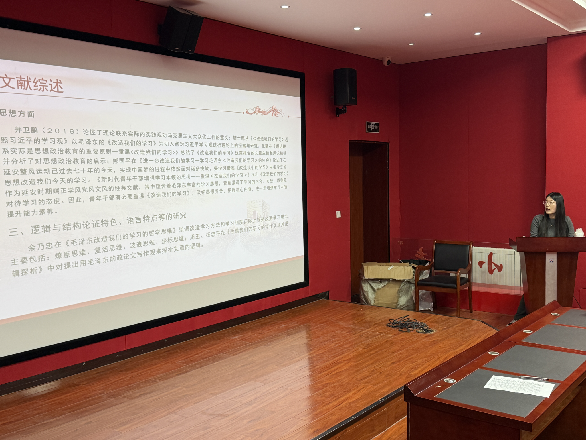 一楼报告厅举行。此次读书会聚焦于毛泽东选集,围绕《改造我们的学习》《反对自由主义》两部经典文献展开深入研讨。2024级思想政治教育方向的硕士研究生李佳、徐春雨两位同学依次登台,就各自研读经典文献的心得与见解作了详细报告分享。